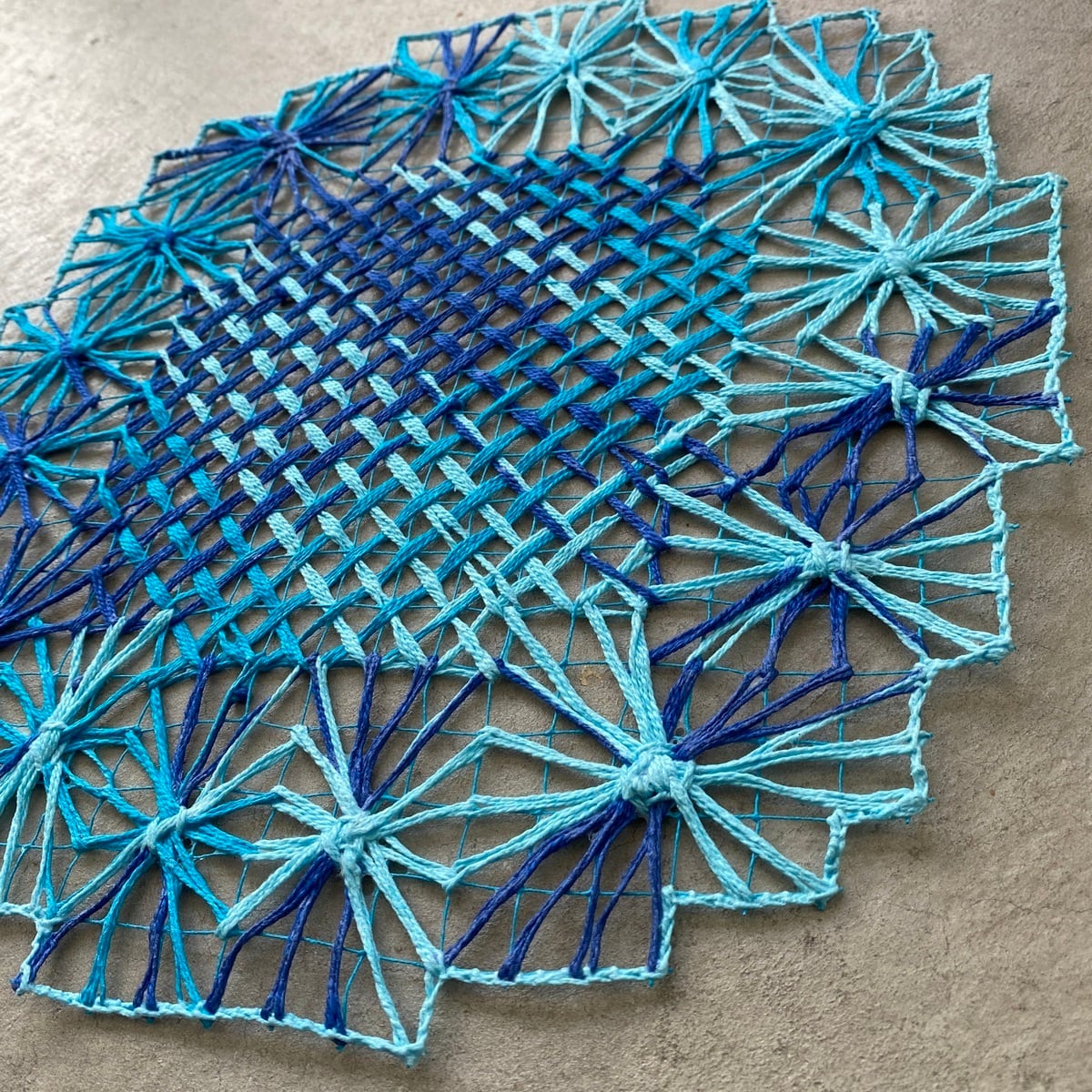 こちらはカラフルで、漁師網に刺繍をしたとも言われ、ベース部も手編みになります。