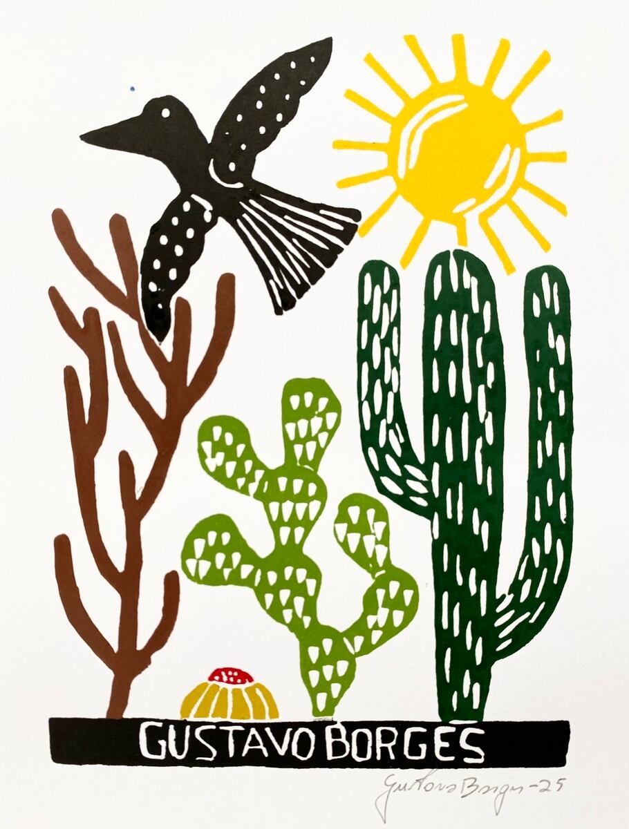 GUSTAVO BORGES グスタボ・ボルジェス 木版画 S【鳥とサボテンの風景】