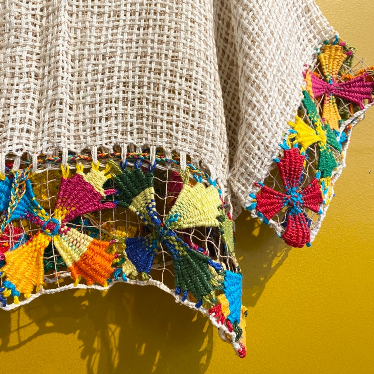 こちらはカラフルで、漁師網に刺繍をしたとも言われ、ベース部も手編みになります。