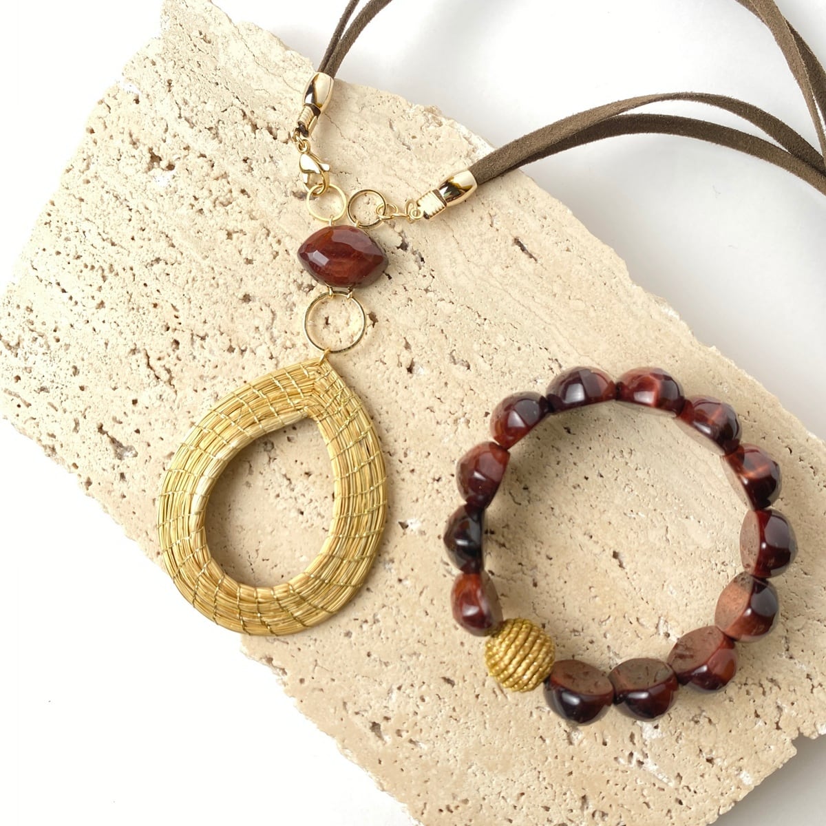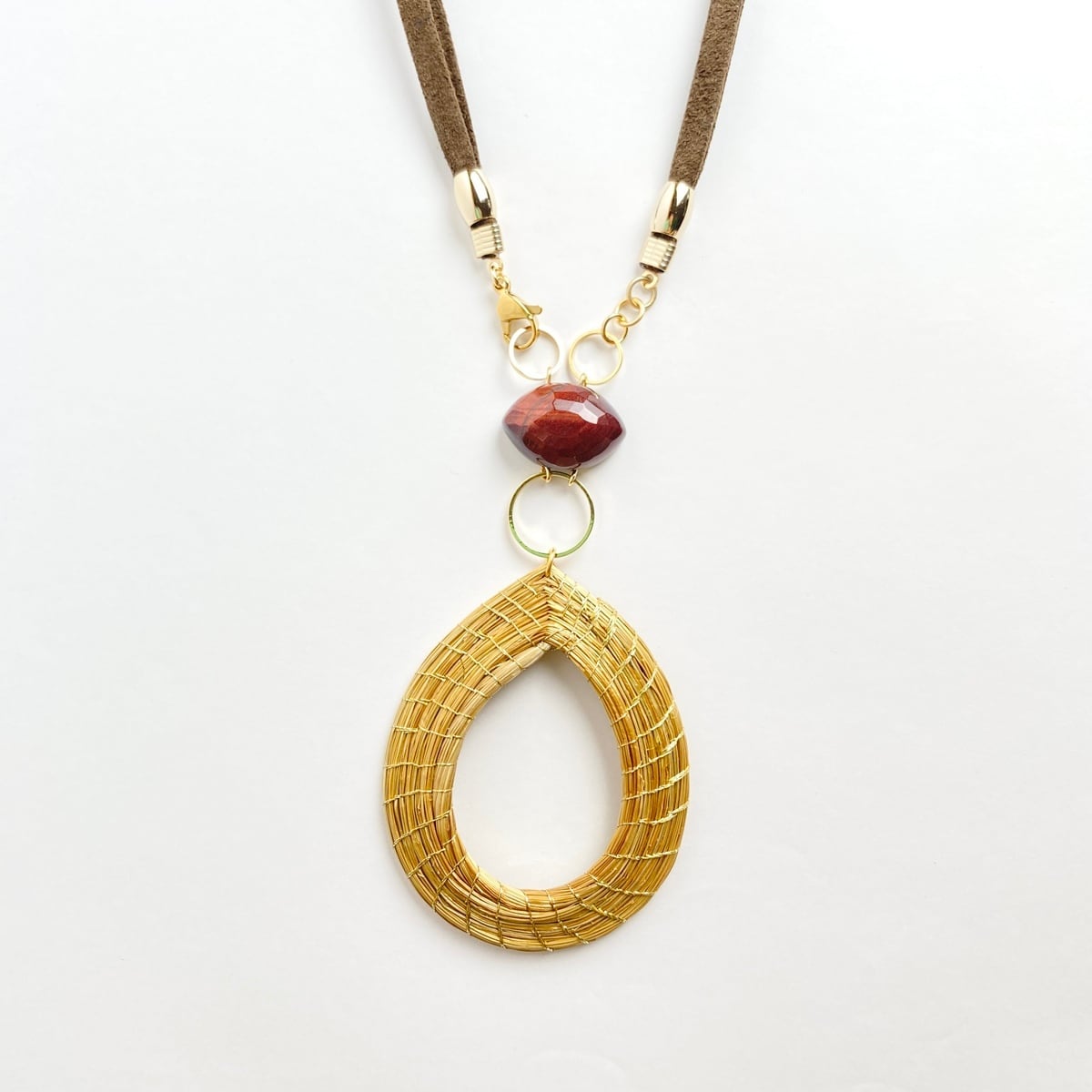 【ビオジュエリー】 黄金の草 カッピンドウラード スエード紐ネックレス ティアドロップ レッドタイガーアイ