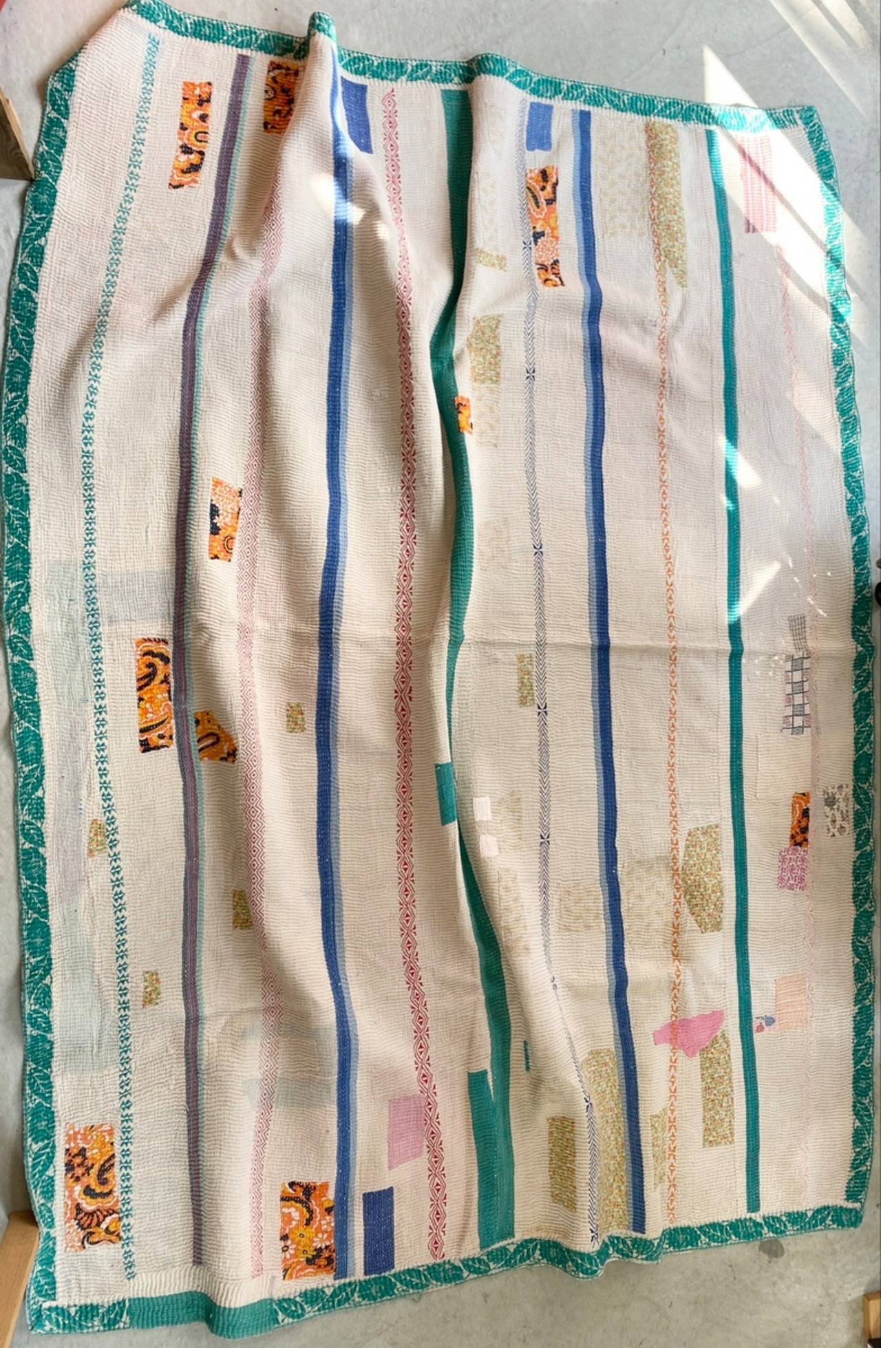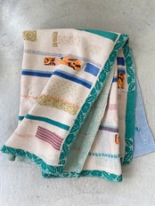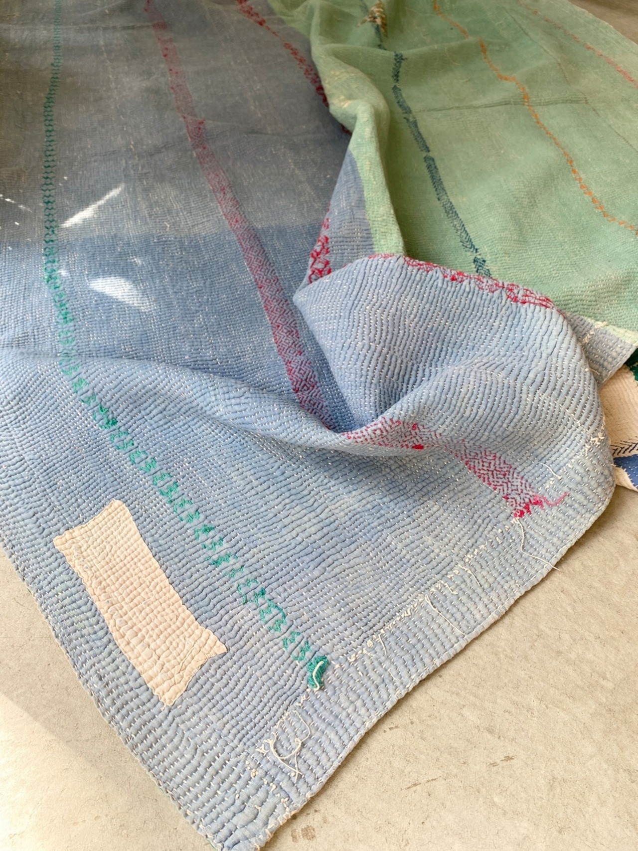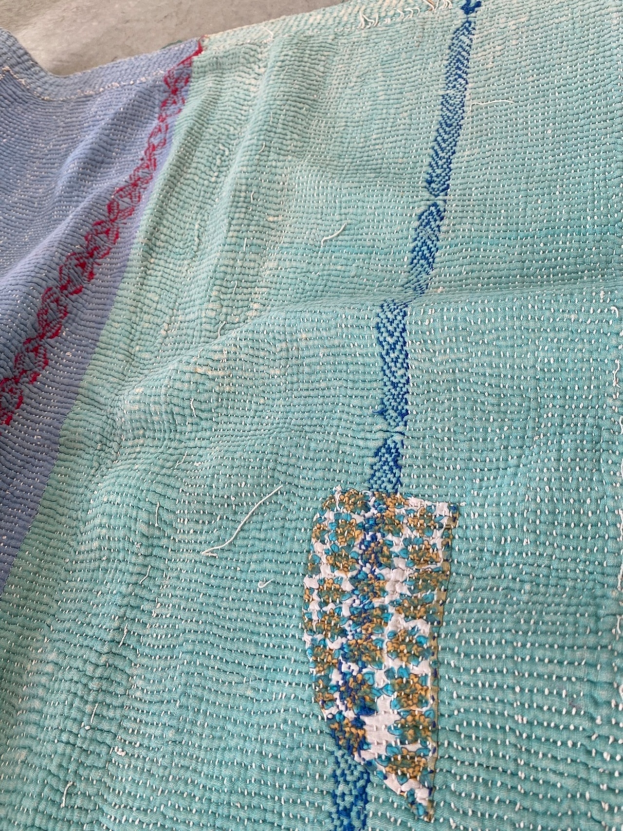 インドの手仕事カンタ刺繍は表と裏に個性的なヴィンテージ生地を合わせながら、ひと針ひと針刺し子で仕上げていきます。味のある素朴で優しい風合いで全てのデザインが一点ものです。