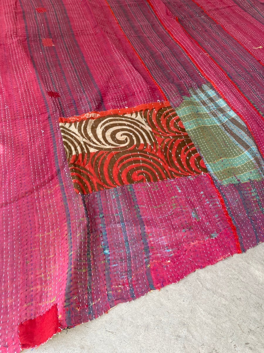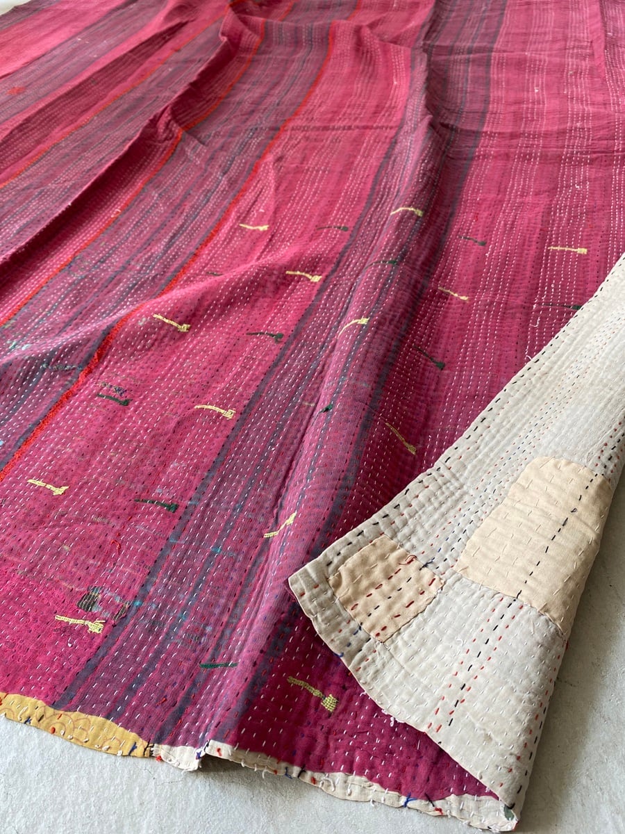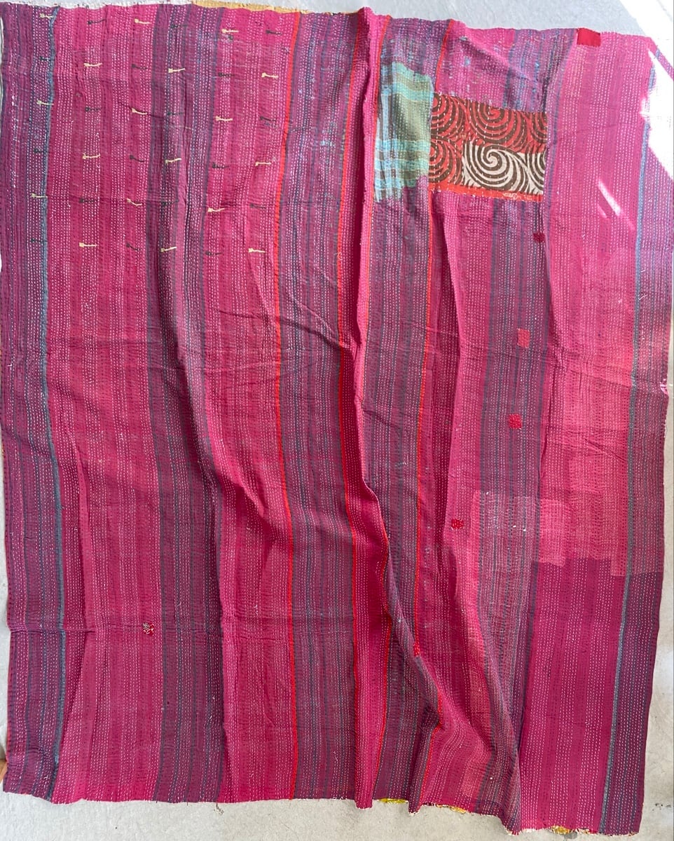 インドの手仕事カンタ刺繍は表と裏に個性的なヴィンテージ生地を合わせながら、ひと針ひと針刺し子で仕上げていきます。味のある素朴で優しい風合いで全てのデザインが一点ものです。