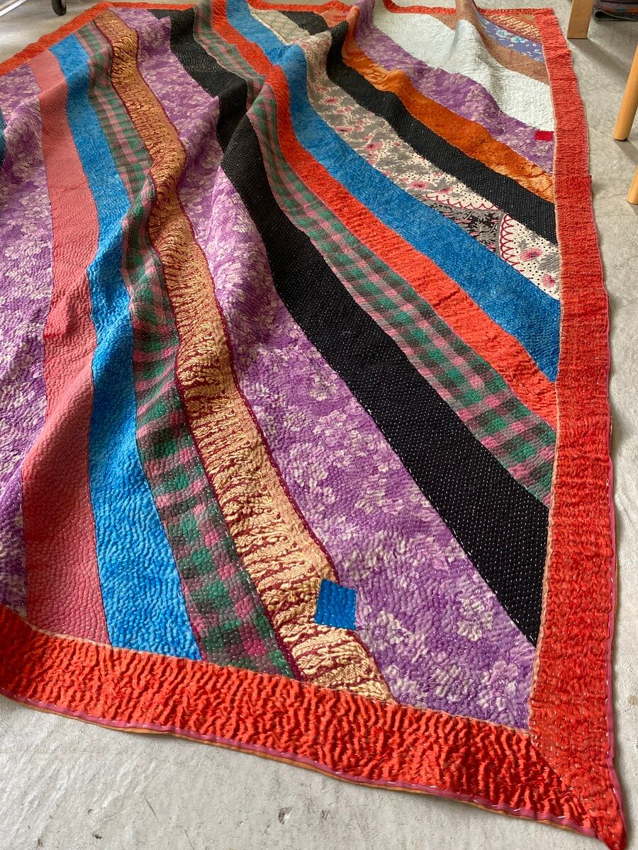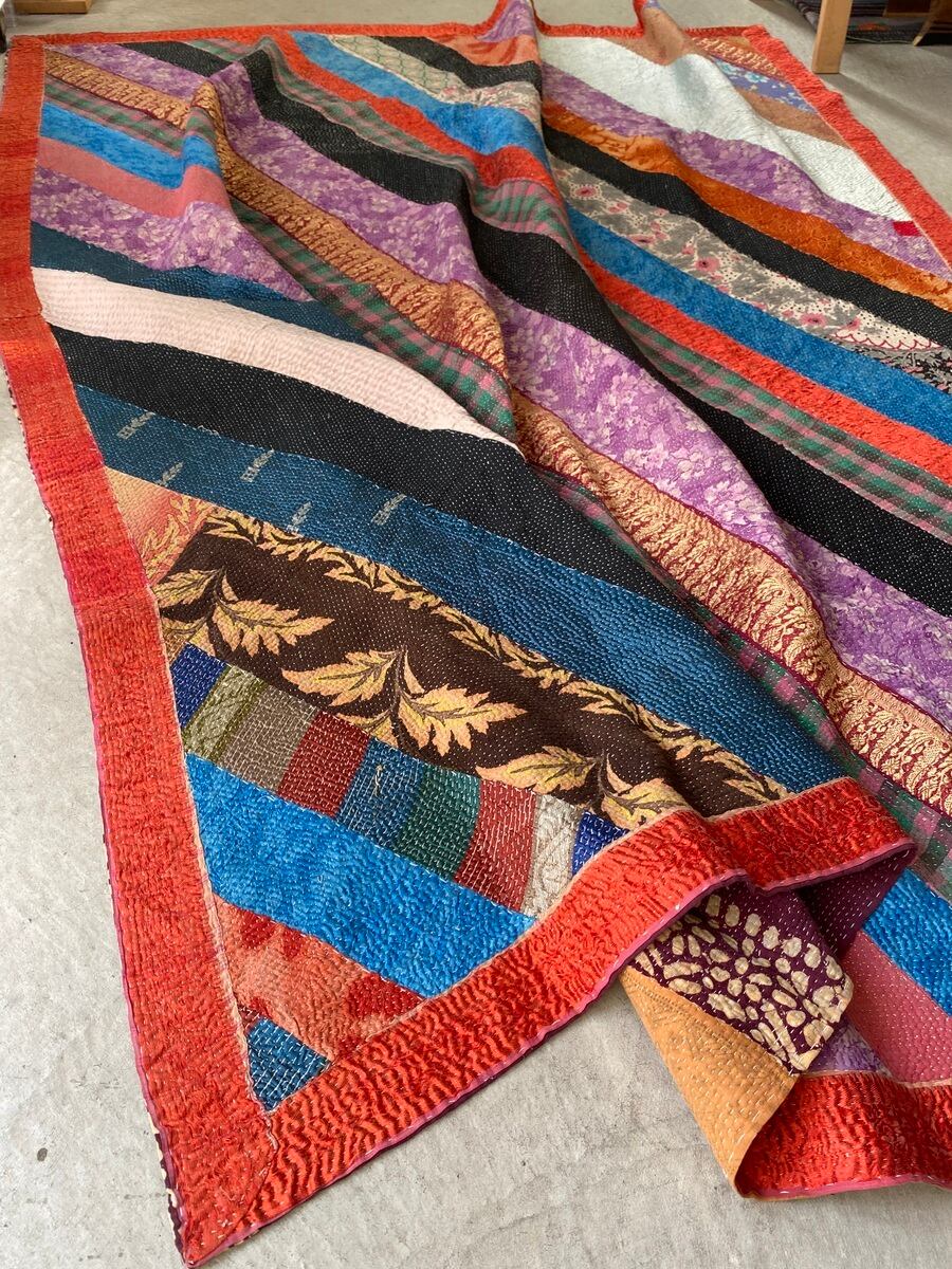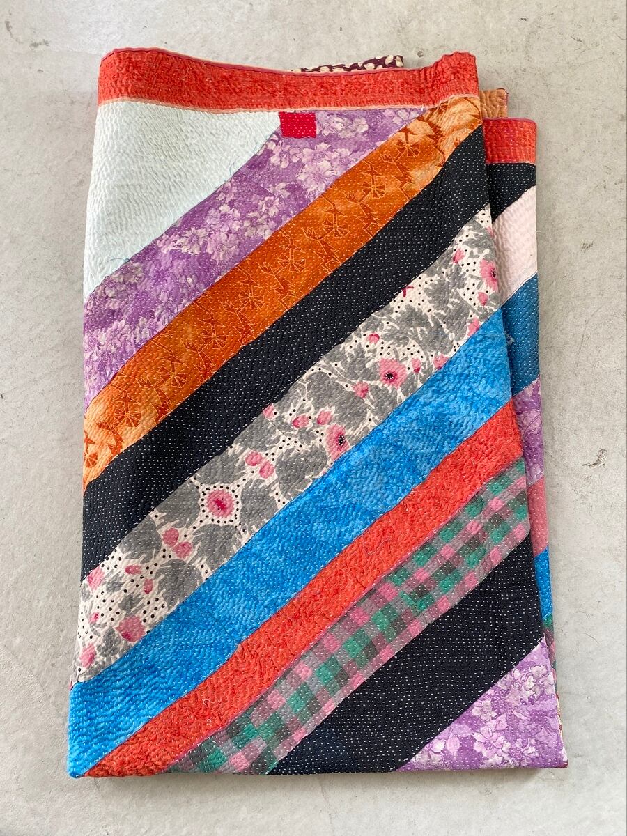 インドの手仕事カンタ刺繍は表と裏に個性的なヴィンテージ生地を合わせながら、ひと針ひと針刺し子で仕上げていきます。味のある素朴で優しい風合いで全てのデザインが一点ものです。