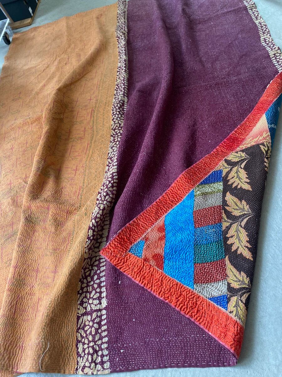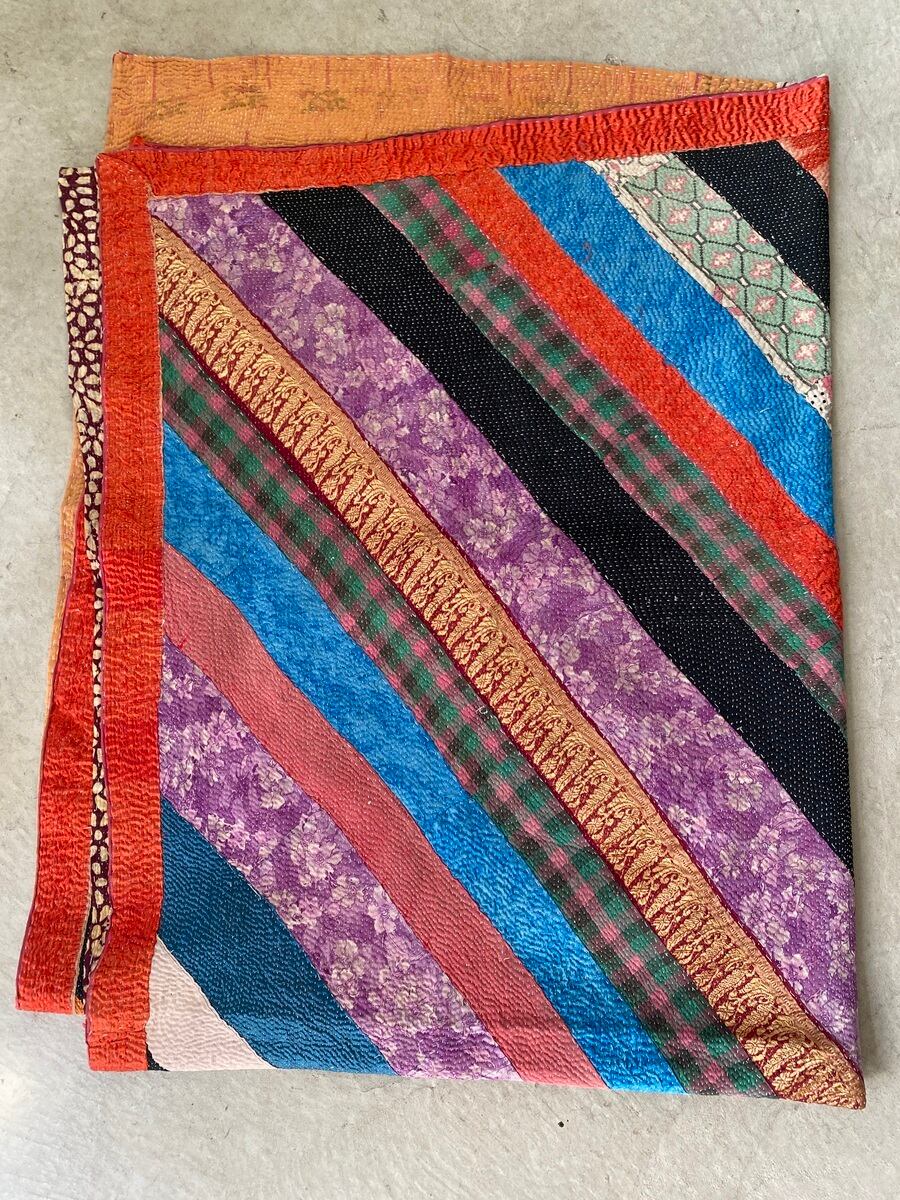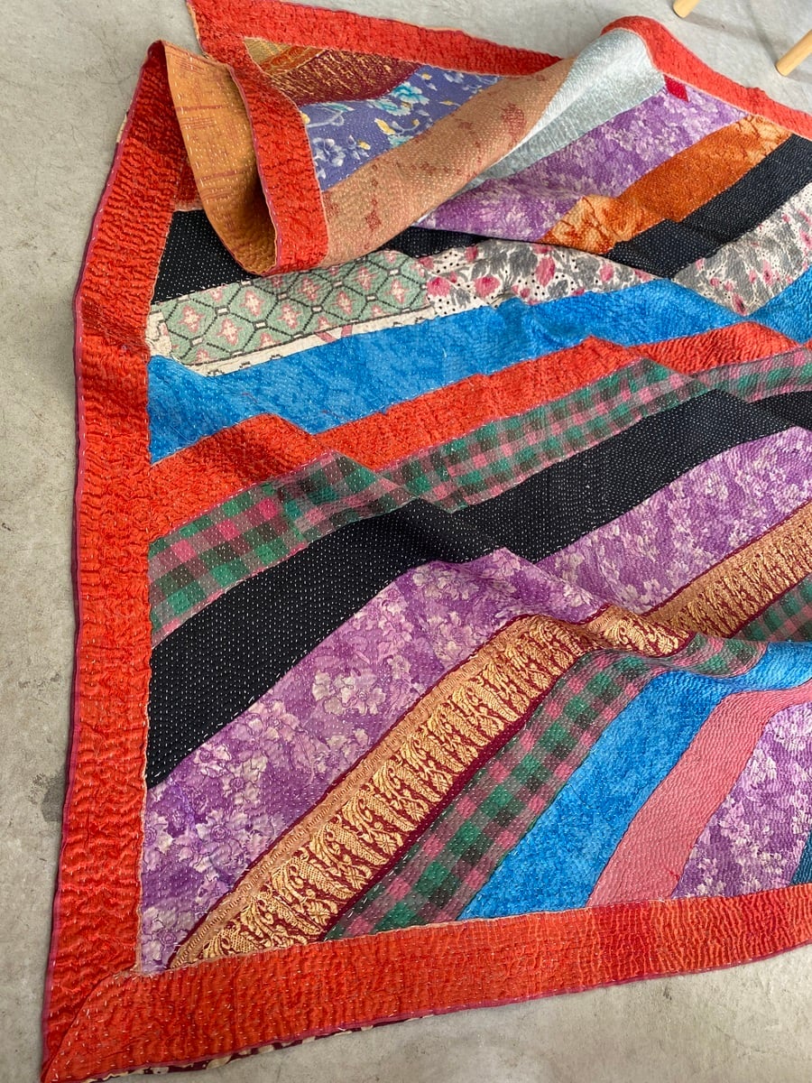 インドの手仕事カンタ刺繍は表と裏に個性的なヴィンテージ生地を合わせながら、ひと針ひと針刺し子で仕上げていきます。味のある素朴で優しい風合いで全てのデザインが一点ものです。