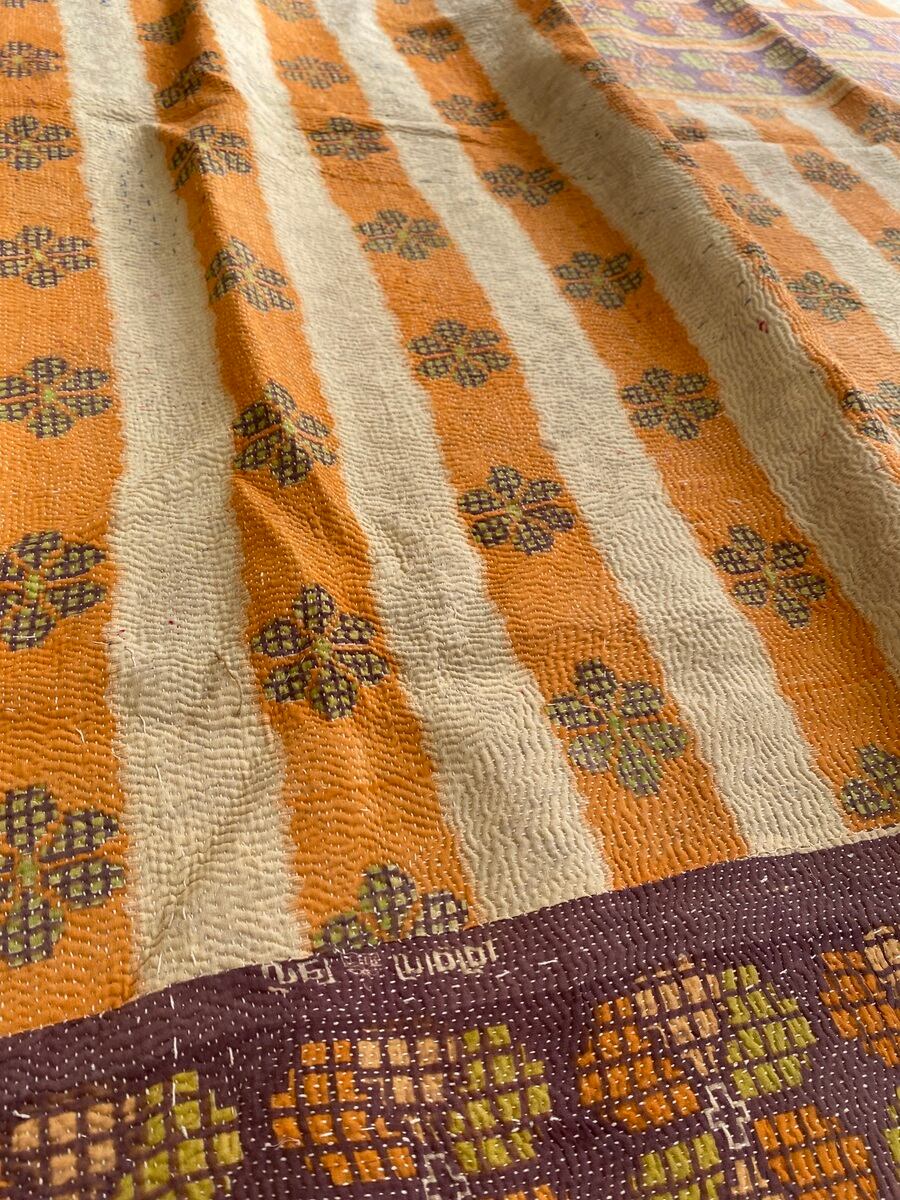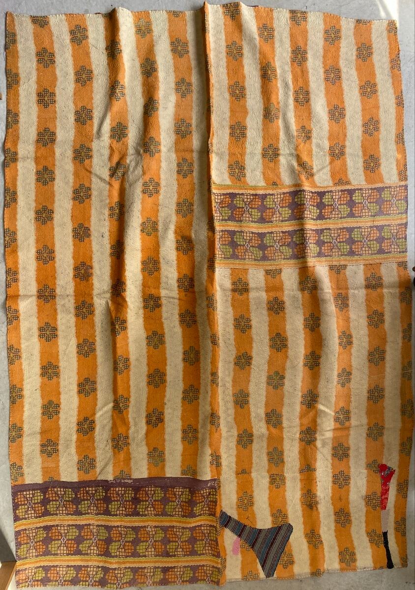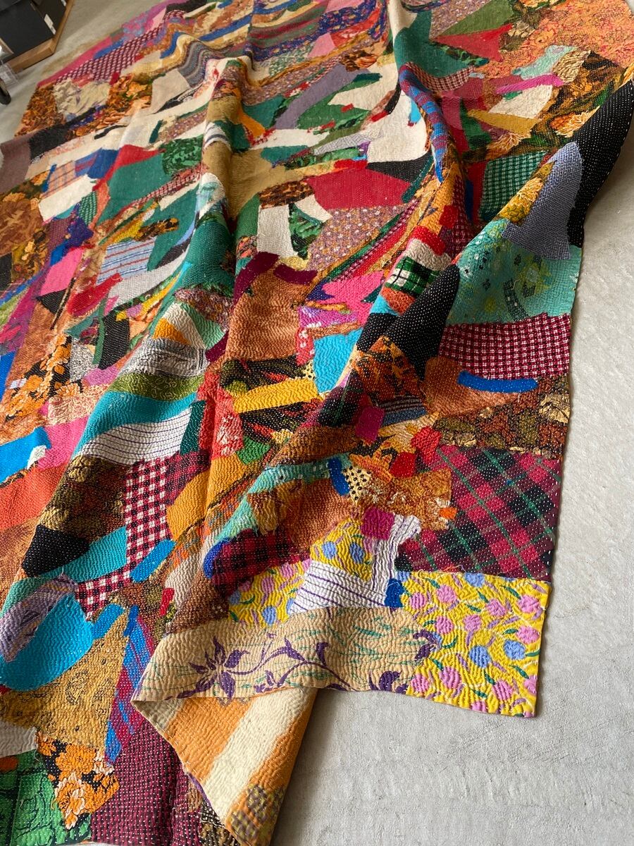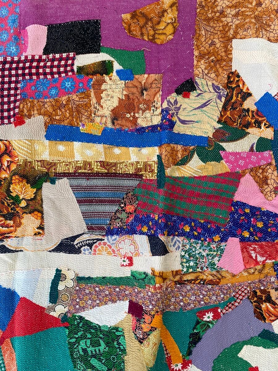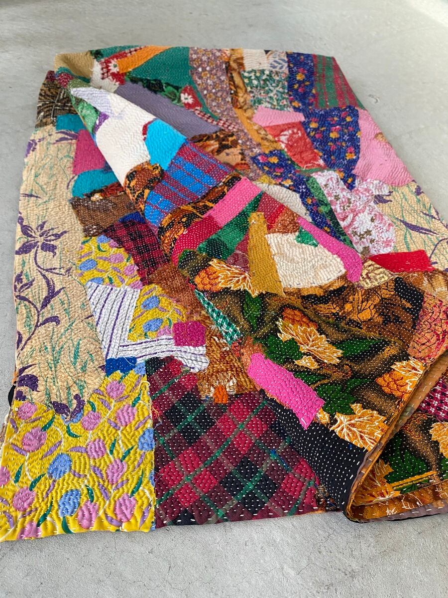 インドの手仕事カンタ刺繍は表と裏に個性的なヴィンテージ生地を合わせながら、ひと針ひと針刺し子で仕上げていきます。味のある素朴で優しい風合いで全てのデザインが一点ものです。