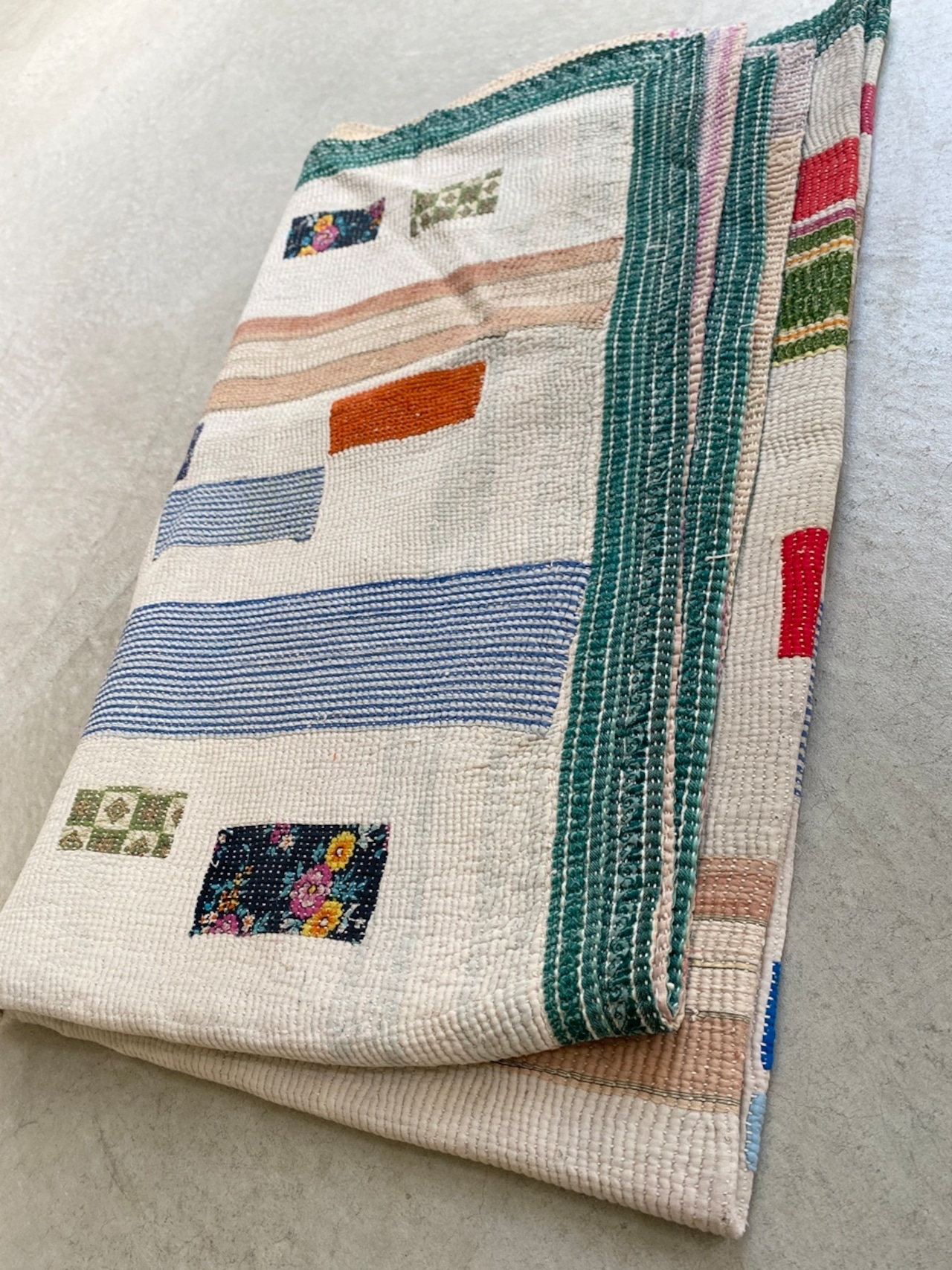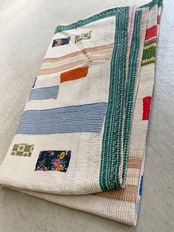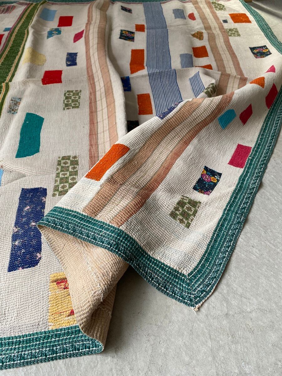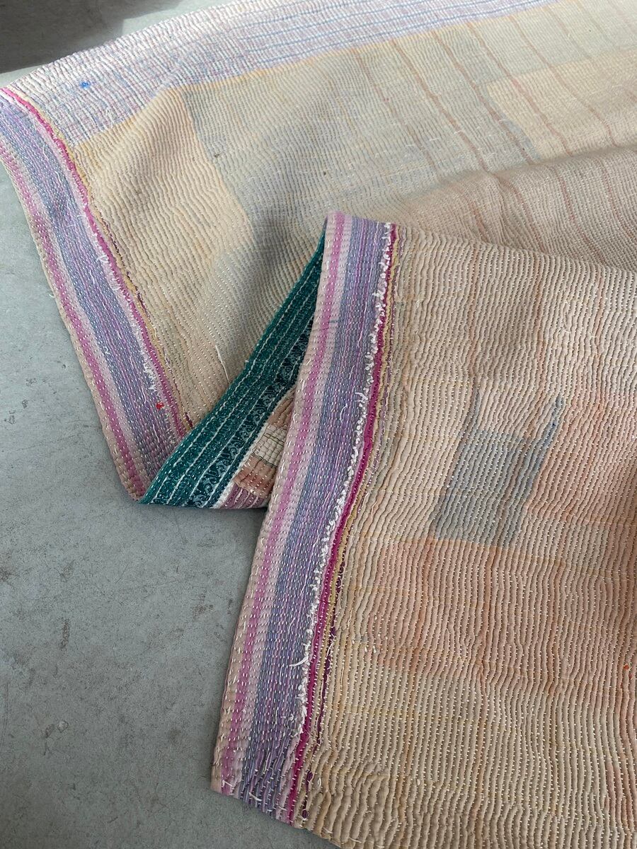 インドの手仕事カンタ刺繍は表と裏に個性的なヴィンテージ生地を合わせながら、ひと針ひと針刺し子で仕上げていきます。味のある素朴で優しい風合いで全てのデザインが一点ものです。