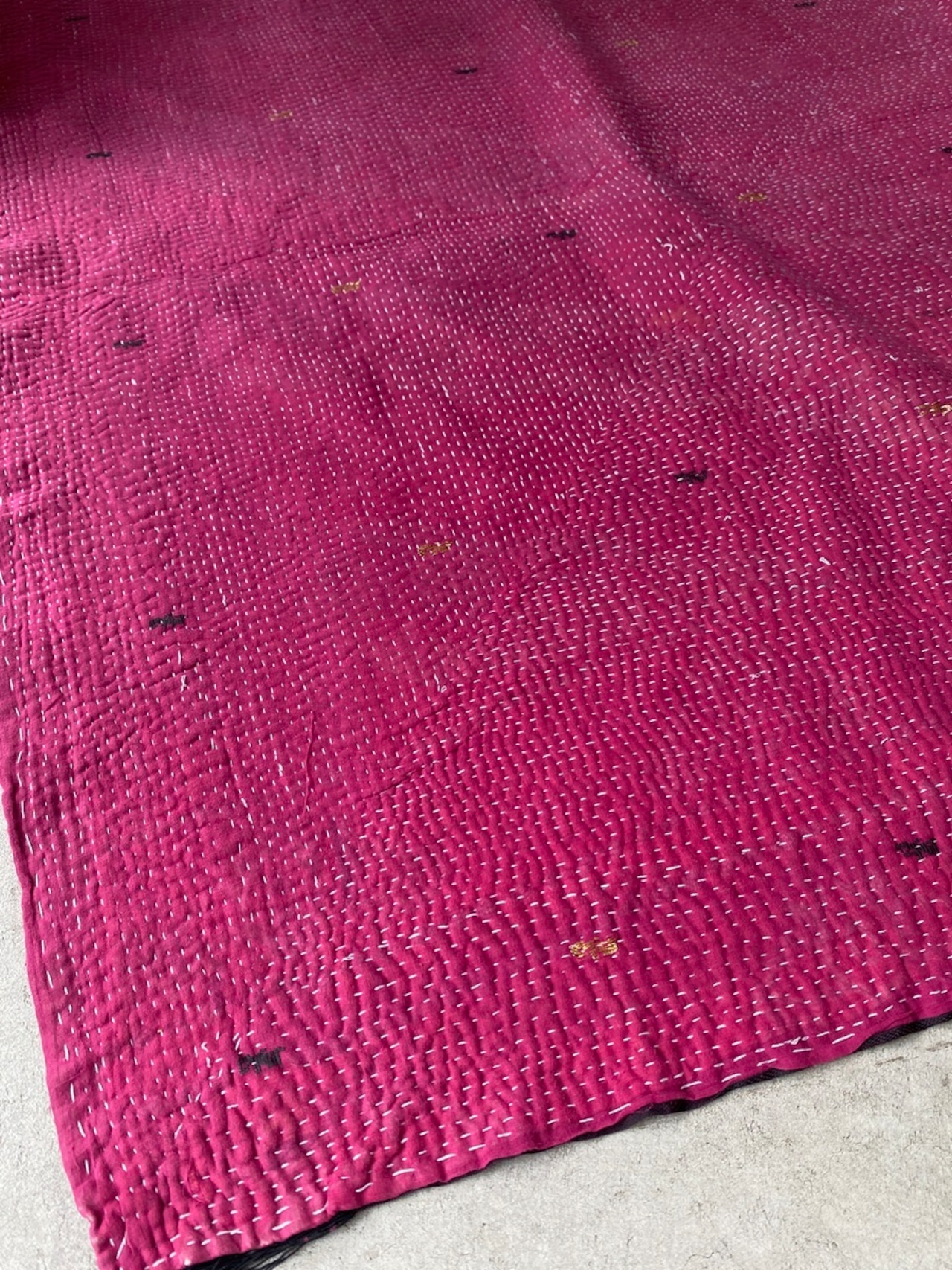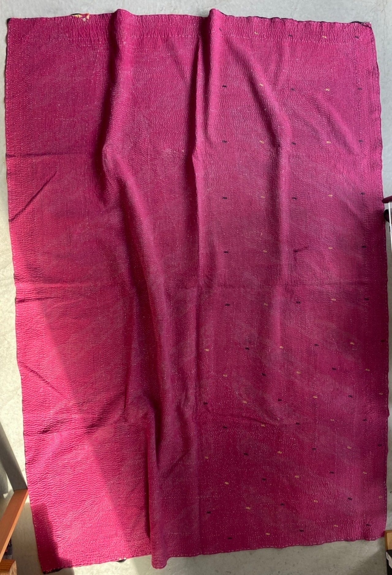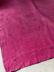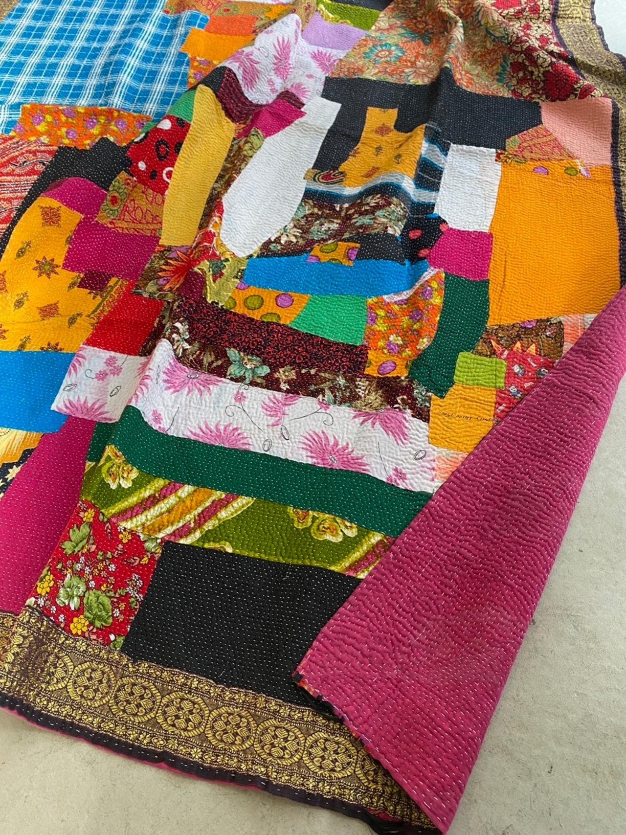これらのカンタラグは、コットンのサリーをベースに、職人それぞれの感性で刺し子を施した リバーシブル仕様。温かみのある手縫いの風合いと、しなやかな生地感が魅力です。