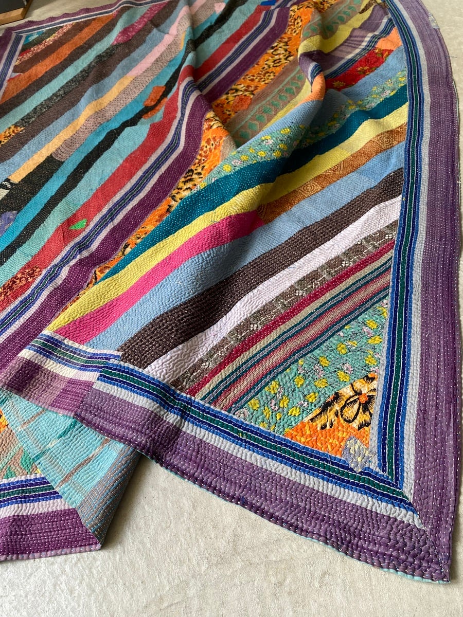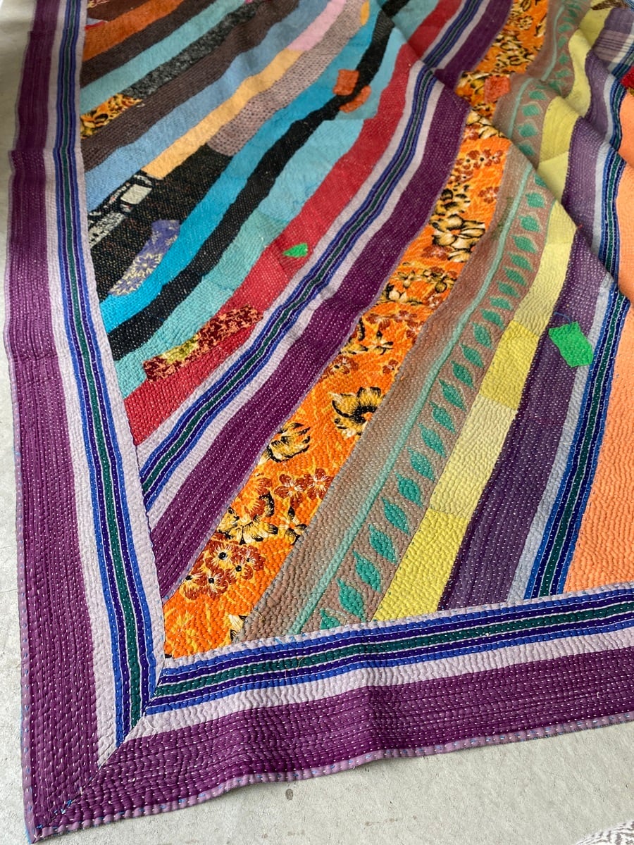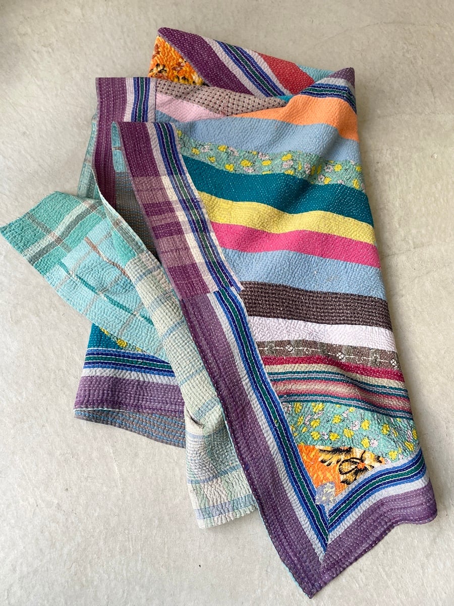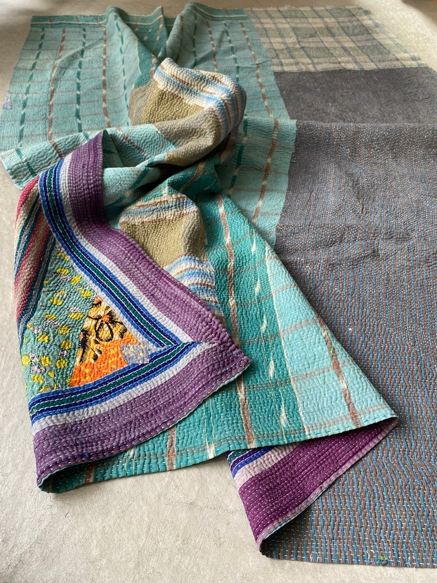 インドの手仕事カンタ刺繍は表と裏に個性的なヴィンテージ生地を合わせながら、ひと針ひと針刺し子で仕上げていきます。味のある素朴で優しい風合いで全てのデザインが一点ものです。