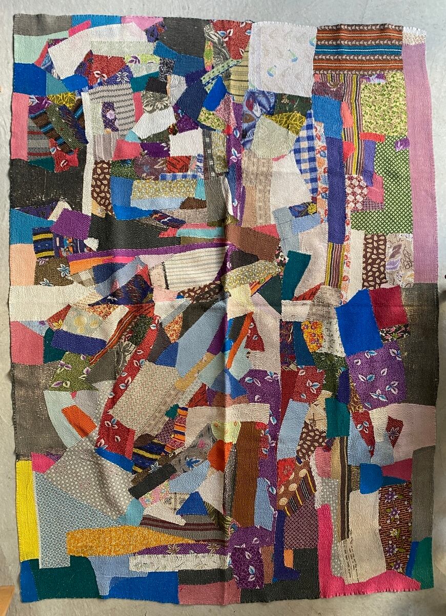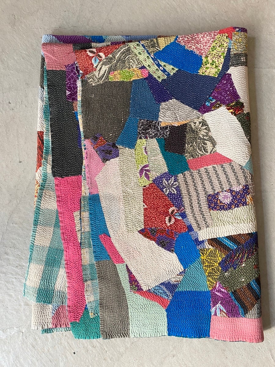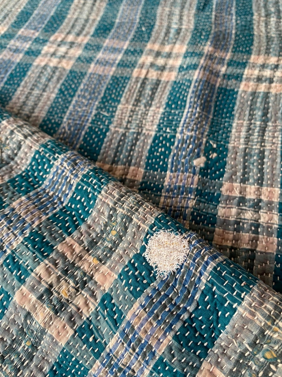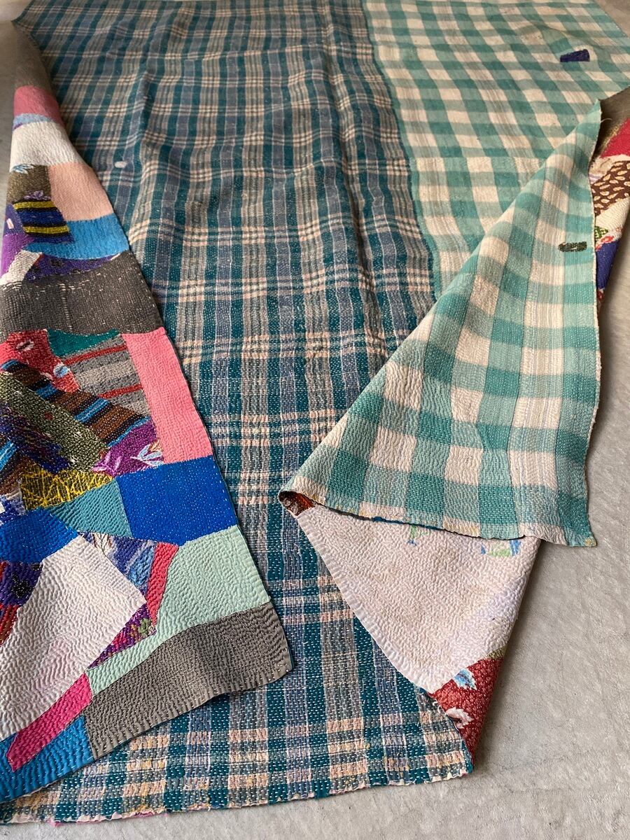 インドの手仕事カンタ刺繍は表と裏に個性的なヴィンテージ生地を合わせながら、ひと針ひと針刺し子で仕上げていきます。味のある素朴で優しい風合いで全てのデザインが一点ものです。