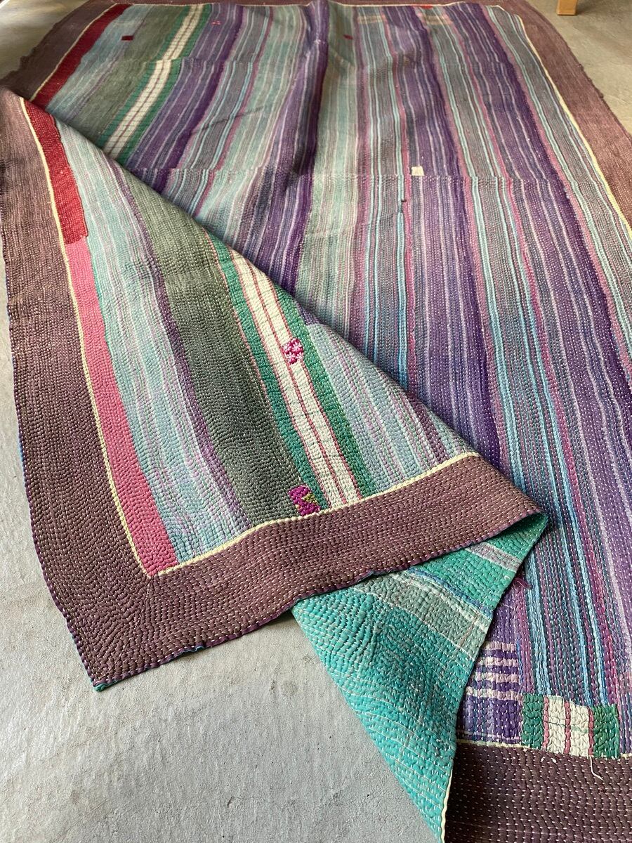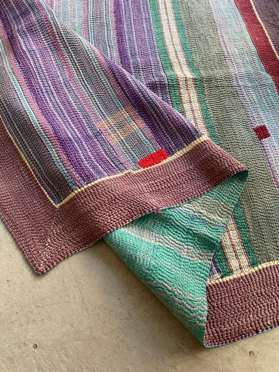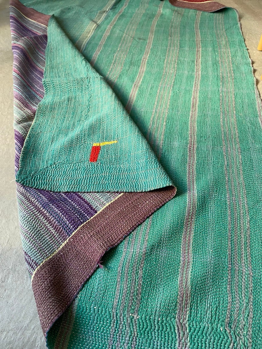 インドの手仕事カンタ刺繍は表と裏に個性的なヴィンテージ生地を合わせながら、ひと針ひと針刺し子で仕上げていきます。味のある素朴で優しい風合いで全てのデザインが一点ものです。