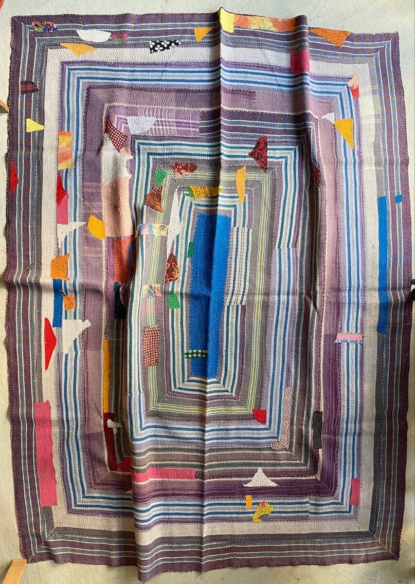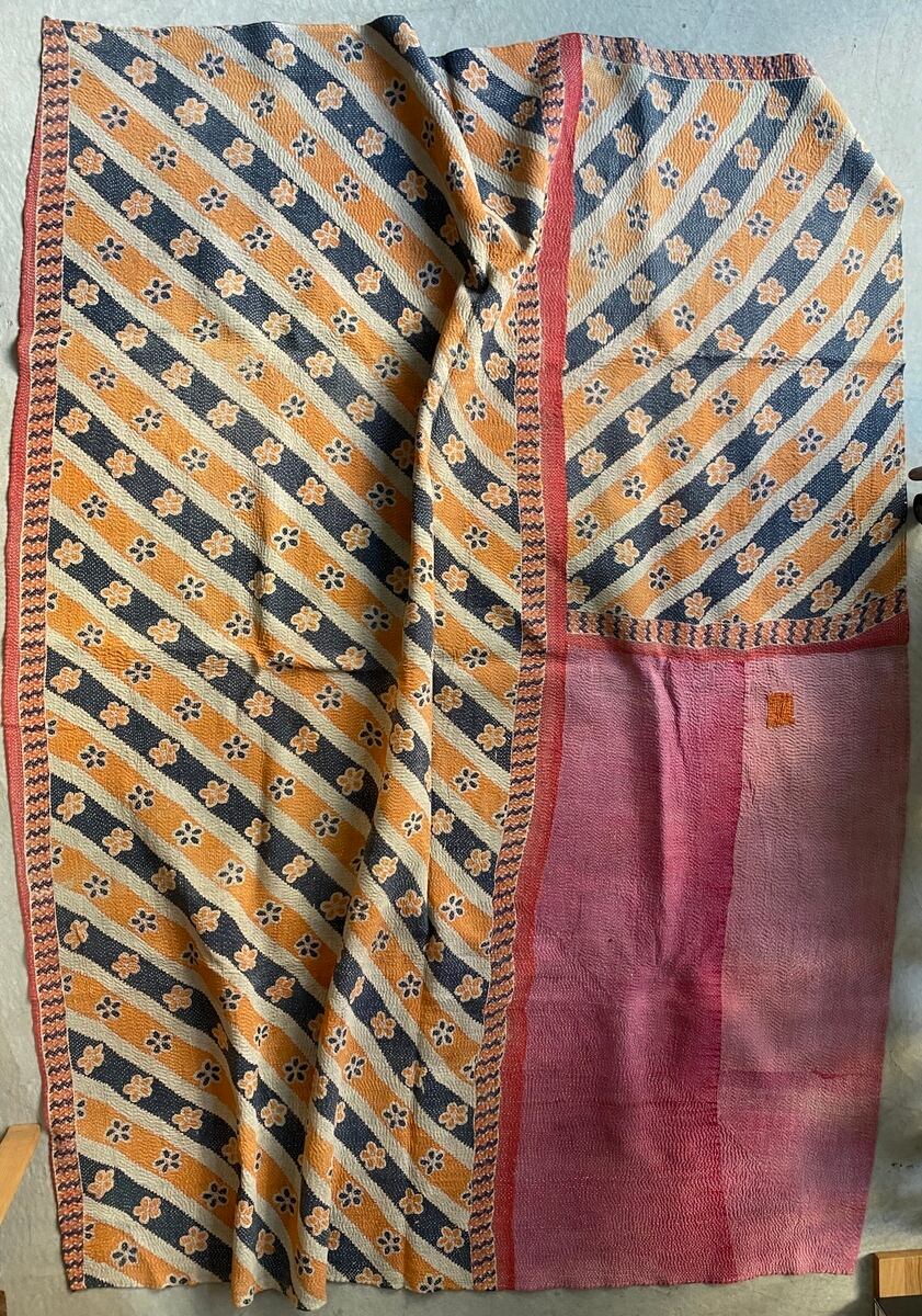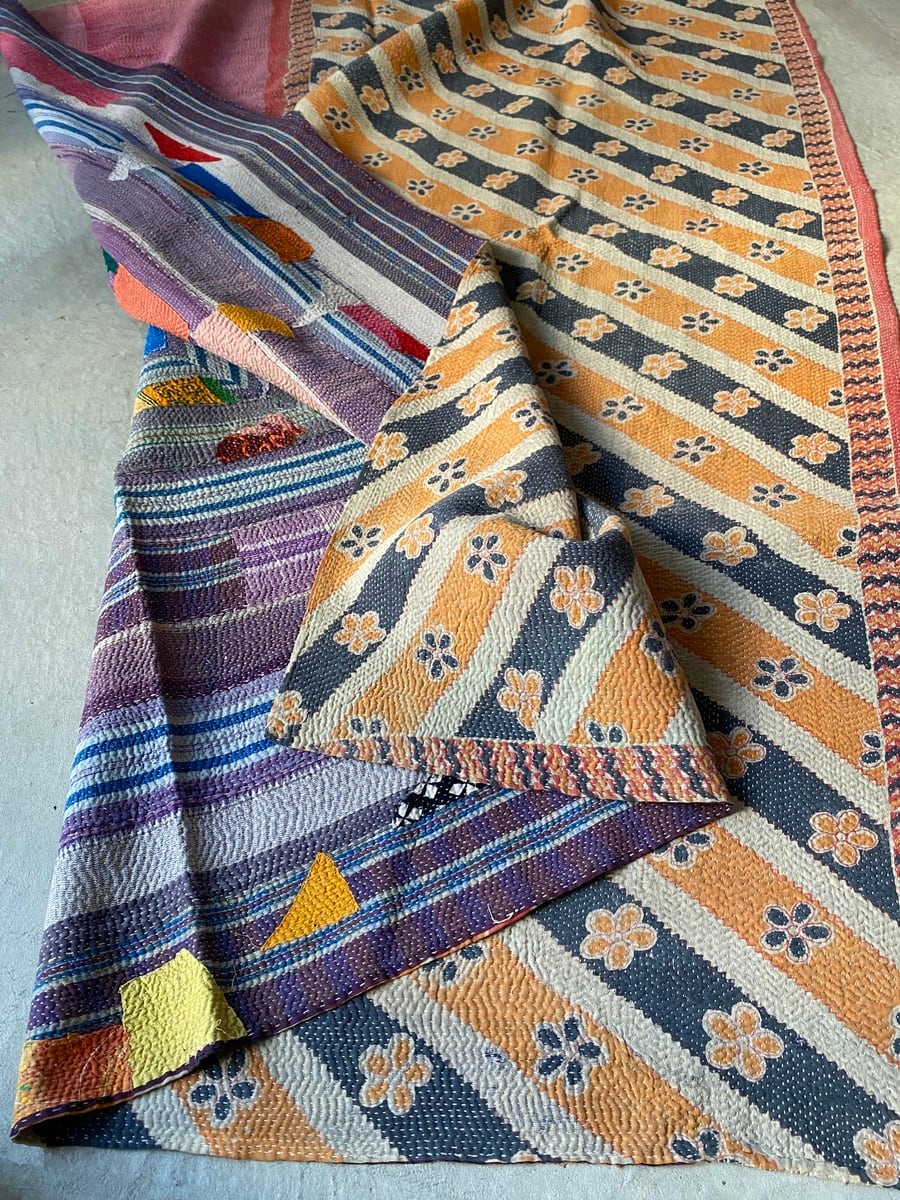 インドの手仕事カンタ刺繍は表と裏に個性的なヴィンテージ生地を合わせながら、ひと針ひと針刺し子で仕上げていきます。味のある素朴で優しい風合いで全てのデザインが一点ものです。