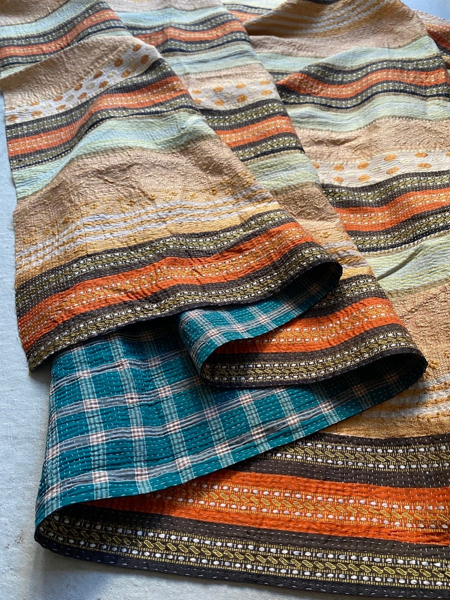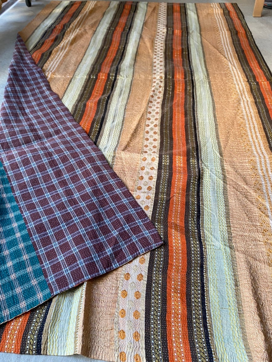 これらのカンタラグは、コットンのサリーをベースに、職人それぞれの感性で刺し子を施した リバーシブル仕様。温かみのある手縫いの風合いと、しなやかな生地感が魅力です。