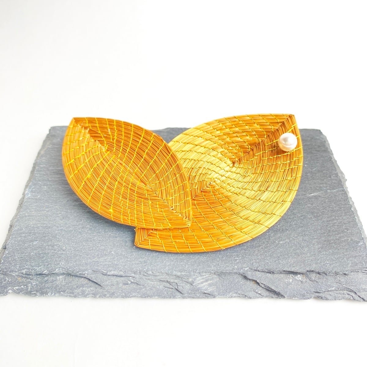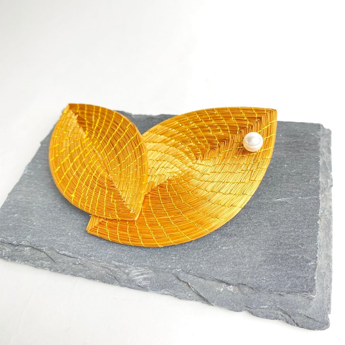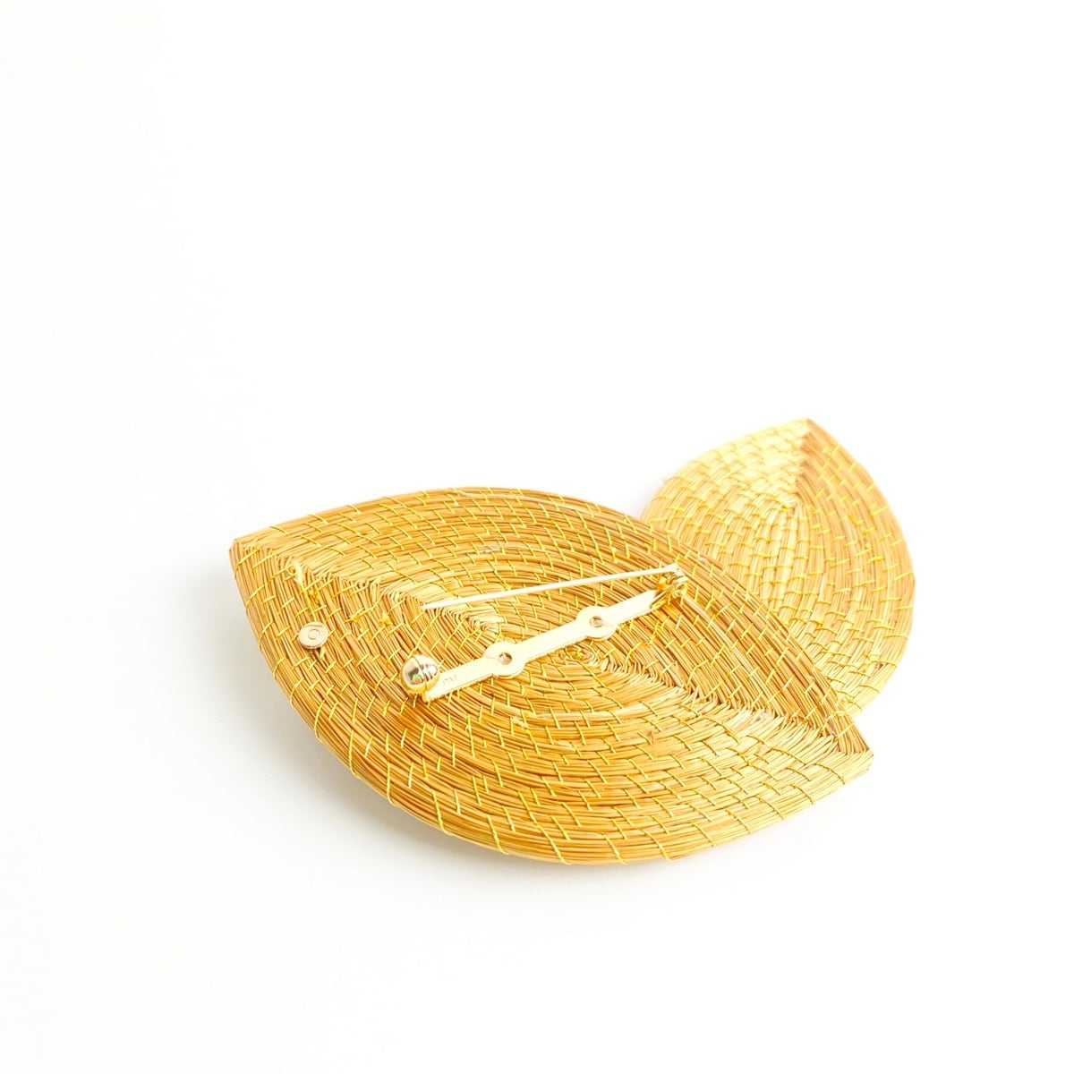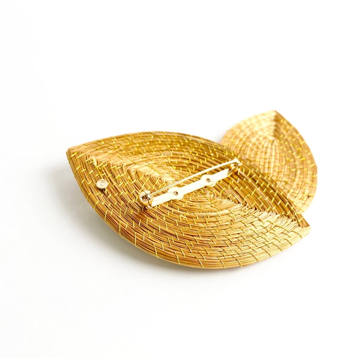 【ビオジュエリー】 黄金の草 カッピンドウラード ブローチ ダブルリーフ スワロフスキーパール