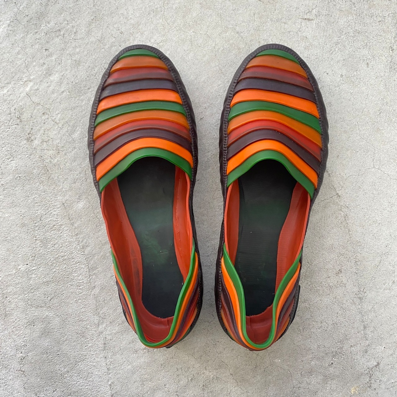 工業製品にはない素朴さと、現代的なフォルムが共存する一足です。