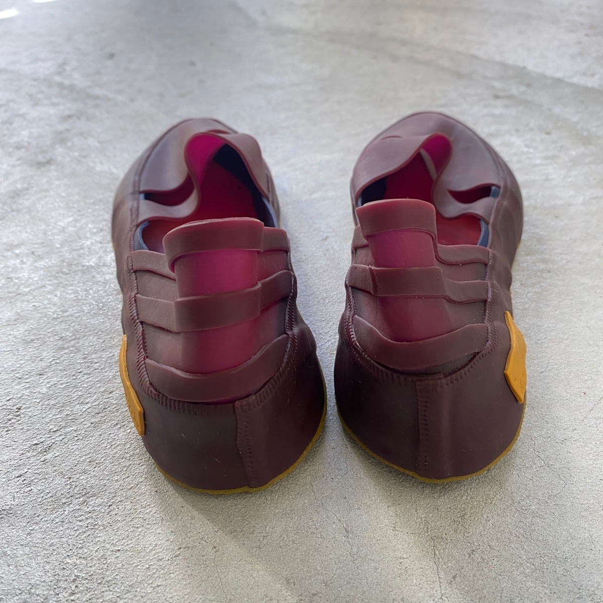 工業製品にはない素朴さと、現代的なフォルムが共存する一足です。