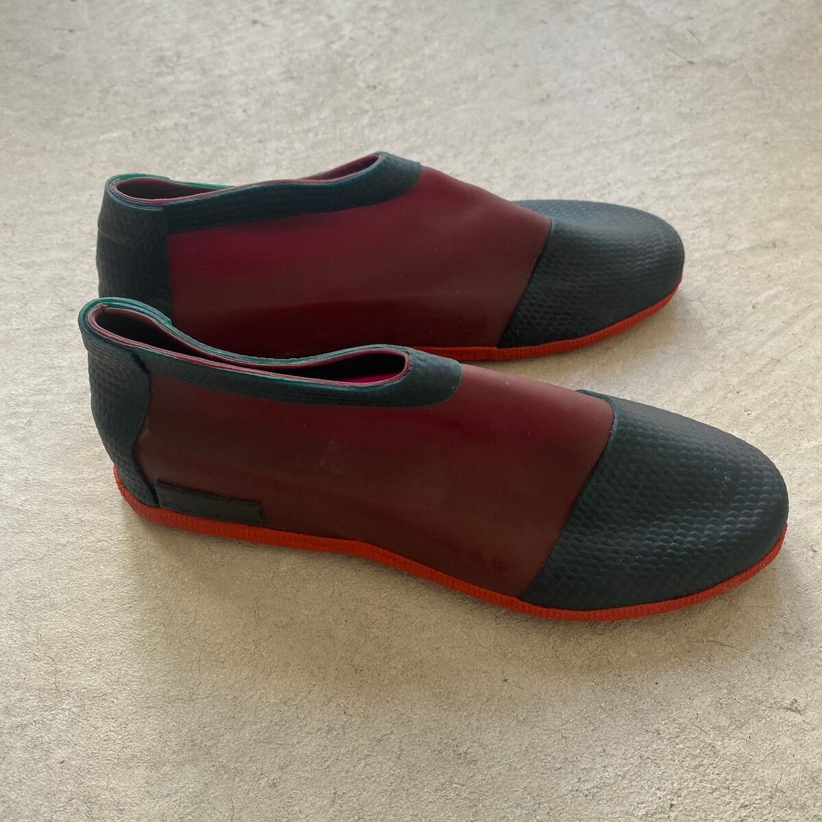 工業製品にはない素朴さと、現代的なフォルムが共存する一足です。