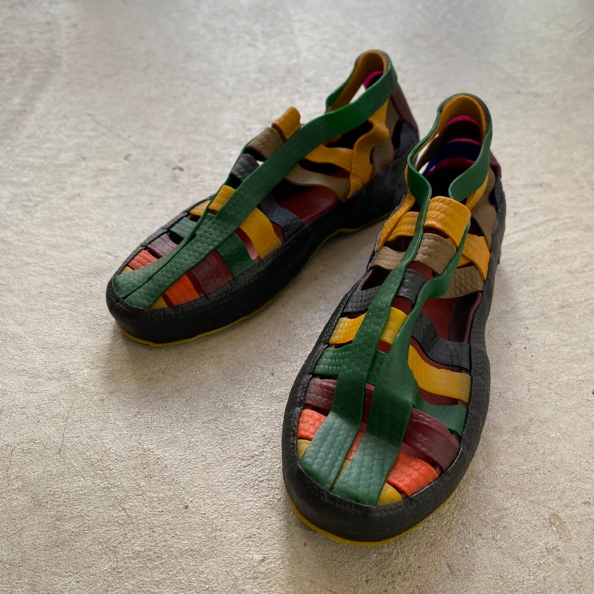 工業製品にはない素朴さと、現代的なフォルムが共存する一足です。