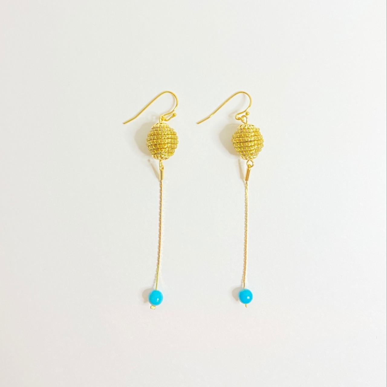 黄金の草のスパイラルボールの下にチェーンで揺れるターコイズの天然石を合わせたデザイン。