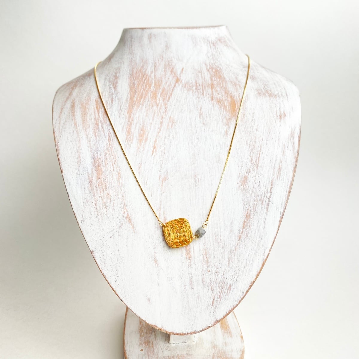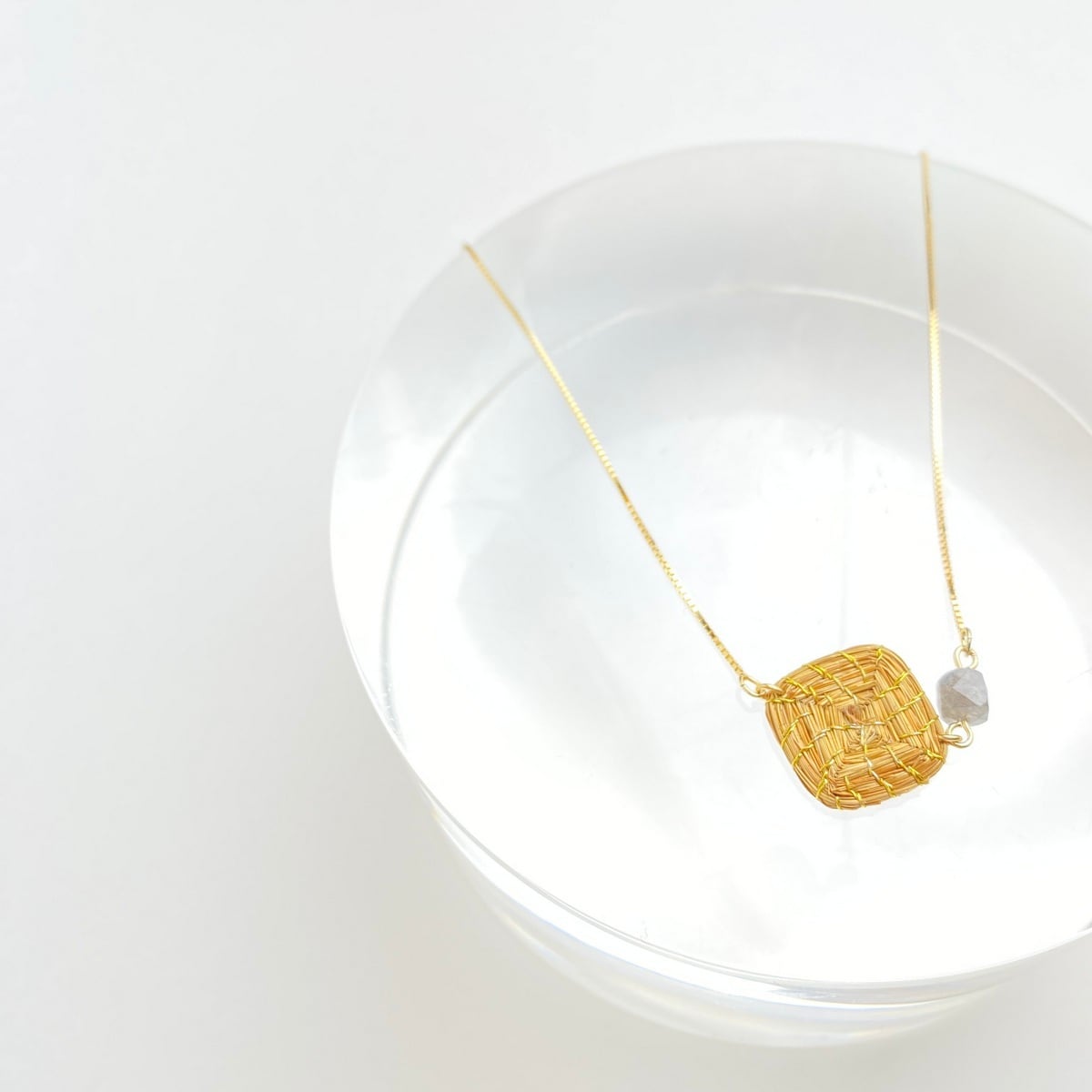黄金の草スクエアモチーフの横にラブラドライトが輝くシックなデザインネックレス。