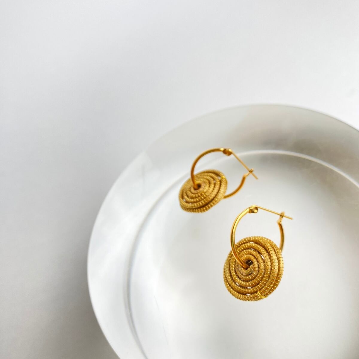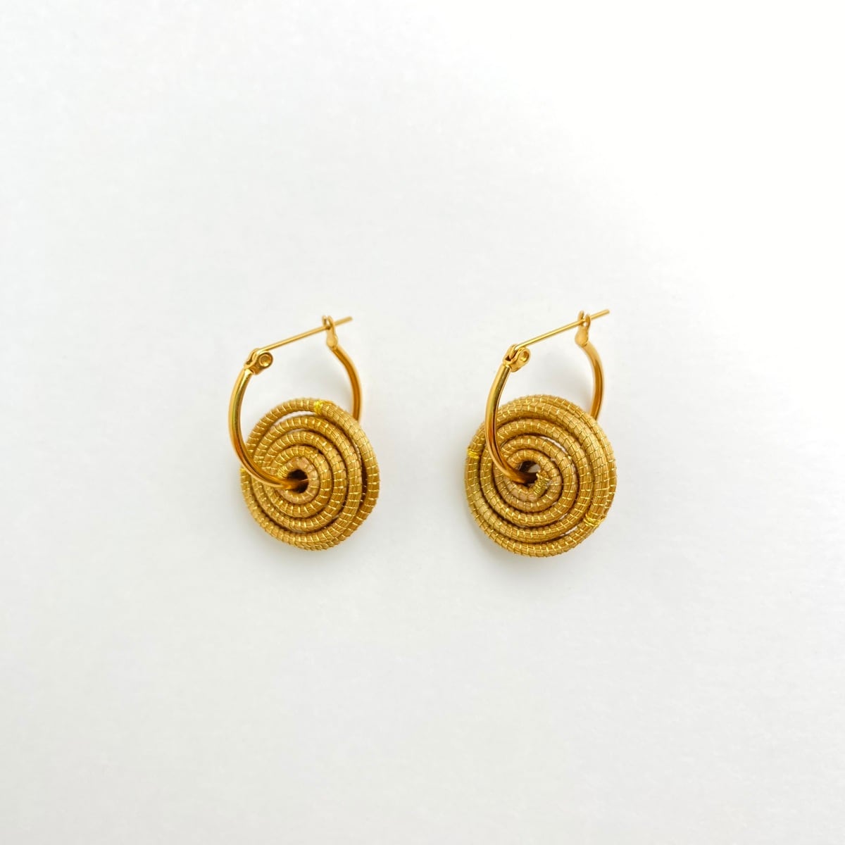 フープピアスやイヤリングに黄金の草スパイラルモチーフをあしらった、シンプルでスタイルのアクセントになるデザインです。