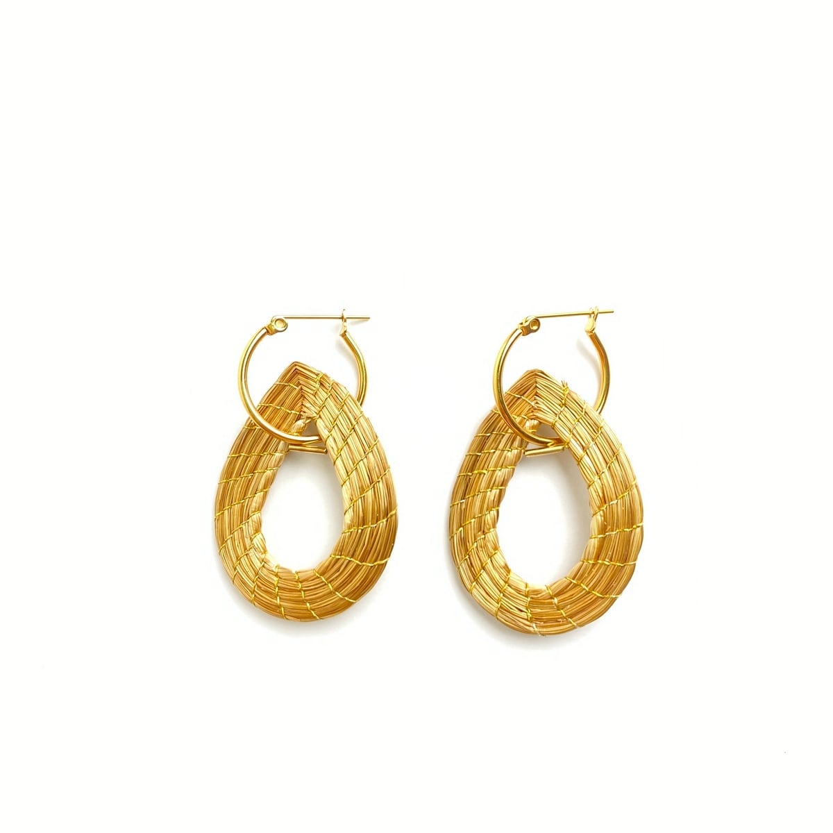 フープピアスやイヤリングに黄金の草ティアドロップモチーフをあしらった、シンプルでスタイルのアクセントになるデザインです。