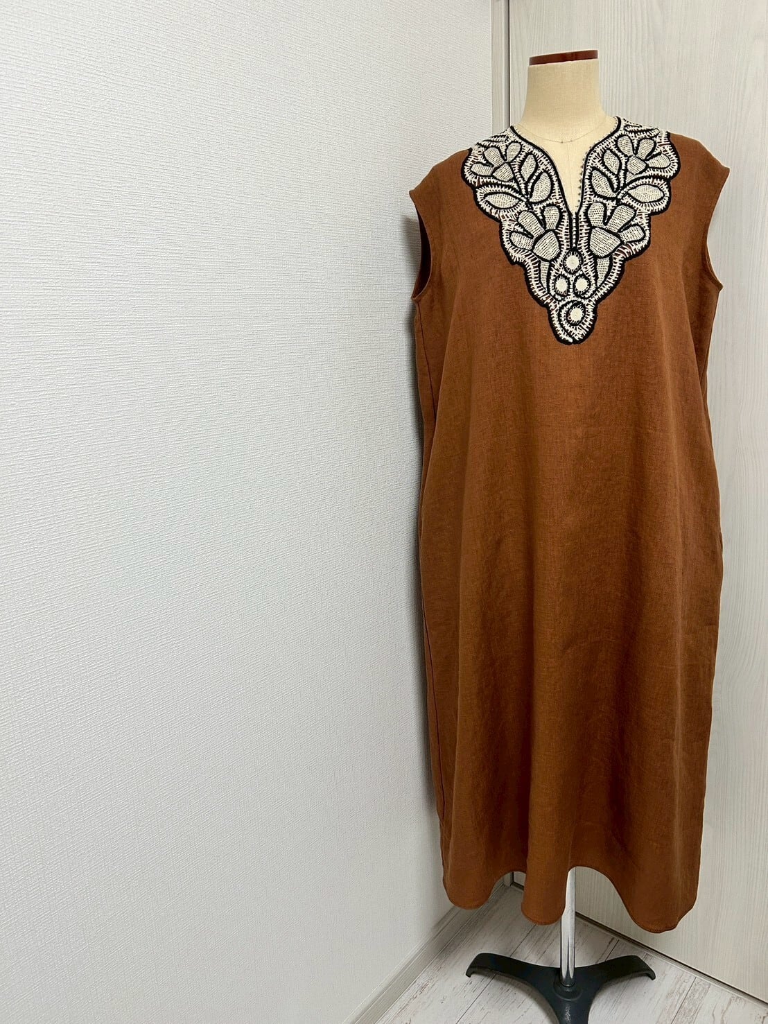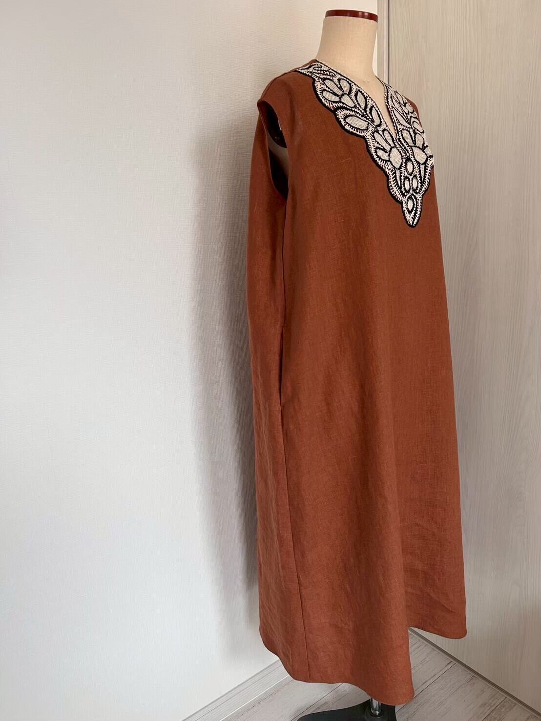 ブラジリアン 手編み ニードルレース リネン フレンチスリーブ ワンピース ブラウン