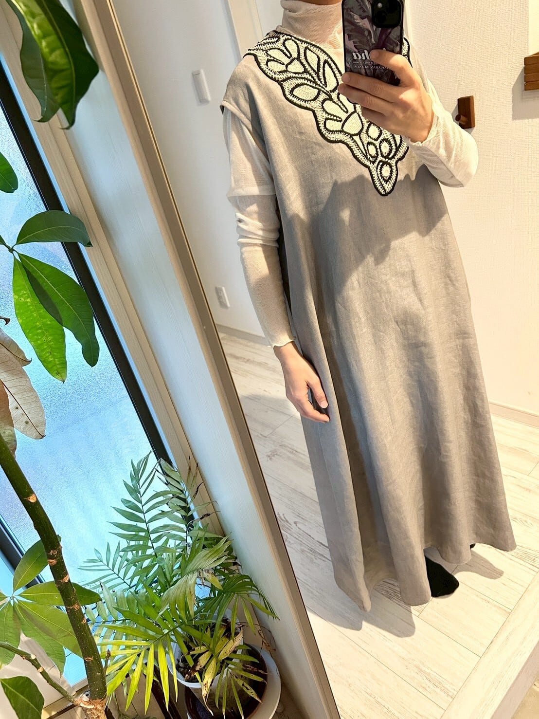 ブラジリアン 手編み ニードルレース リネン フレンチスリーブ ワンピース グレー