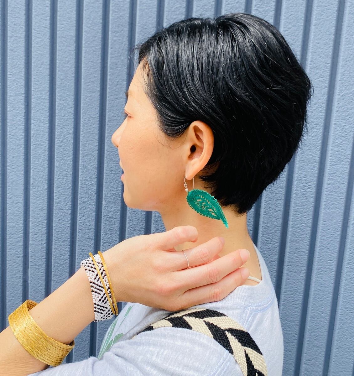 カレンシルバーのカッティングビーズが輝く、羽のように軽いカラーレースピアスです。