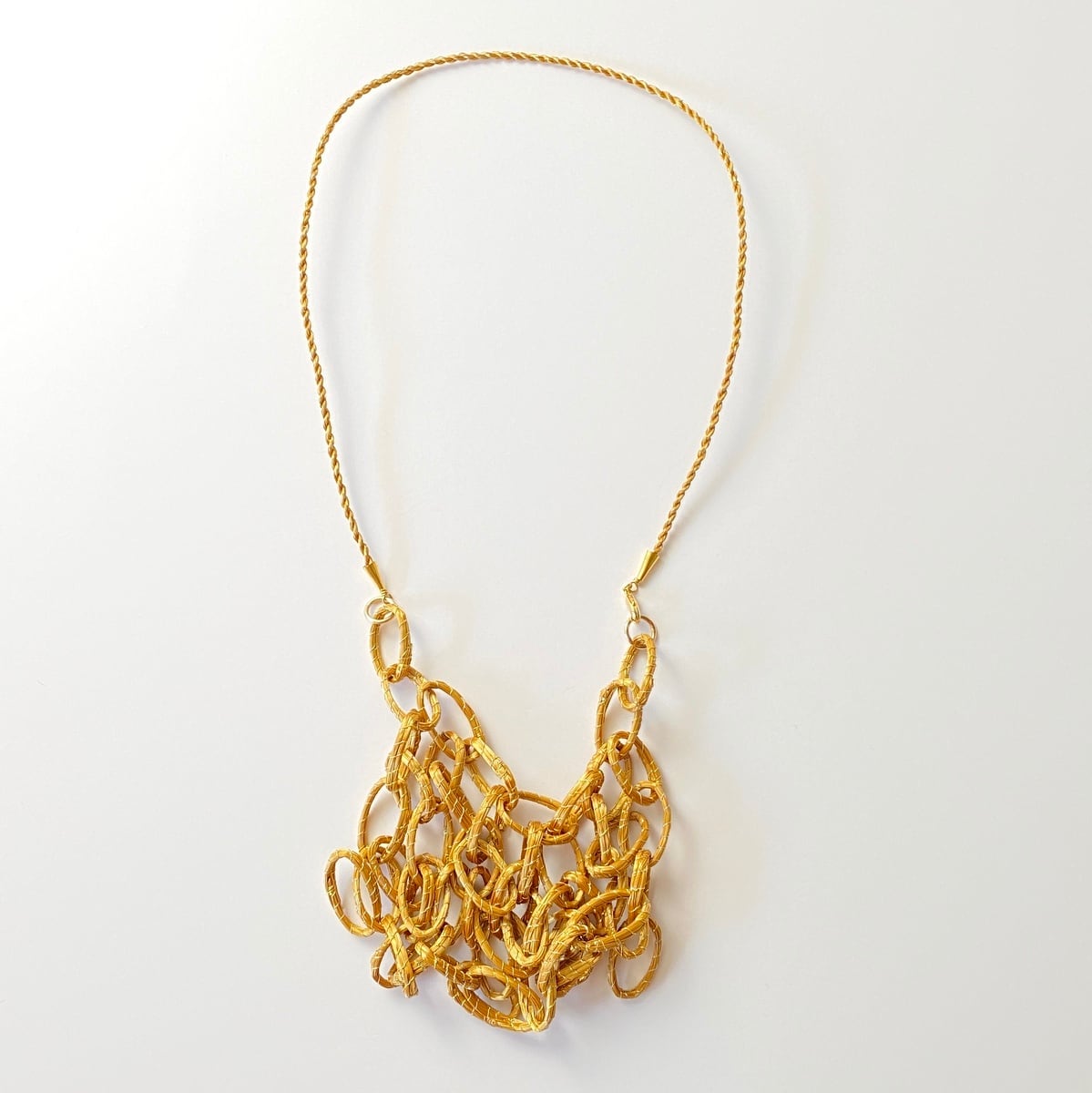ユニークなチェーンモチーフのロングネックレス。黄金の草をよった紐がユニーク。金属アレルギーの方にもおすすめです。