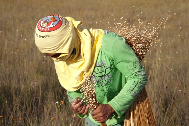 一見金属にしか見えないこのゴールド色の素材は、黄金の草そのものの輝きなんです。