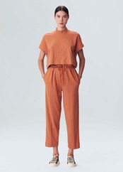 伸縮性のある丈が短めのトップス。