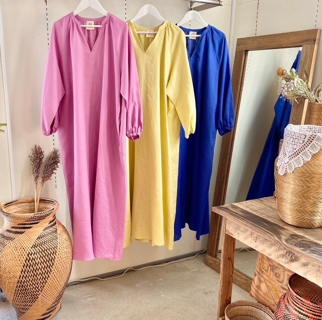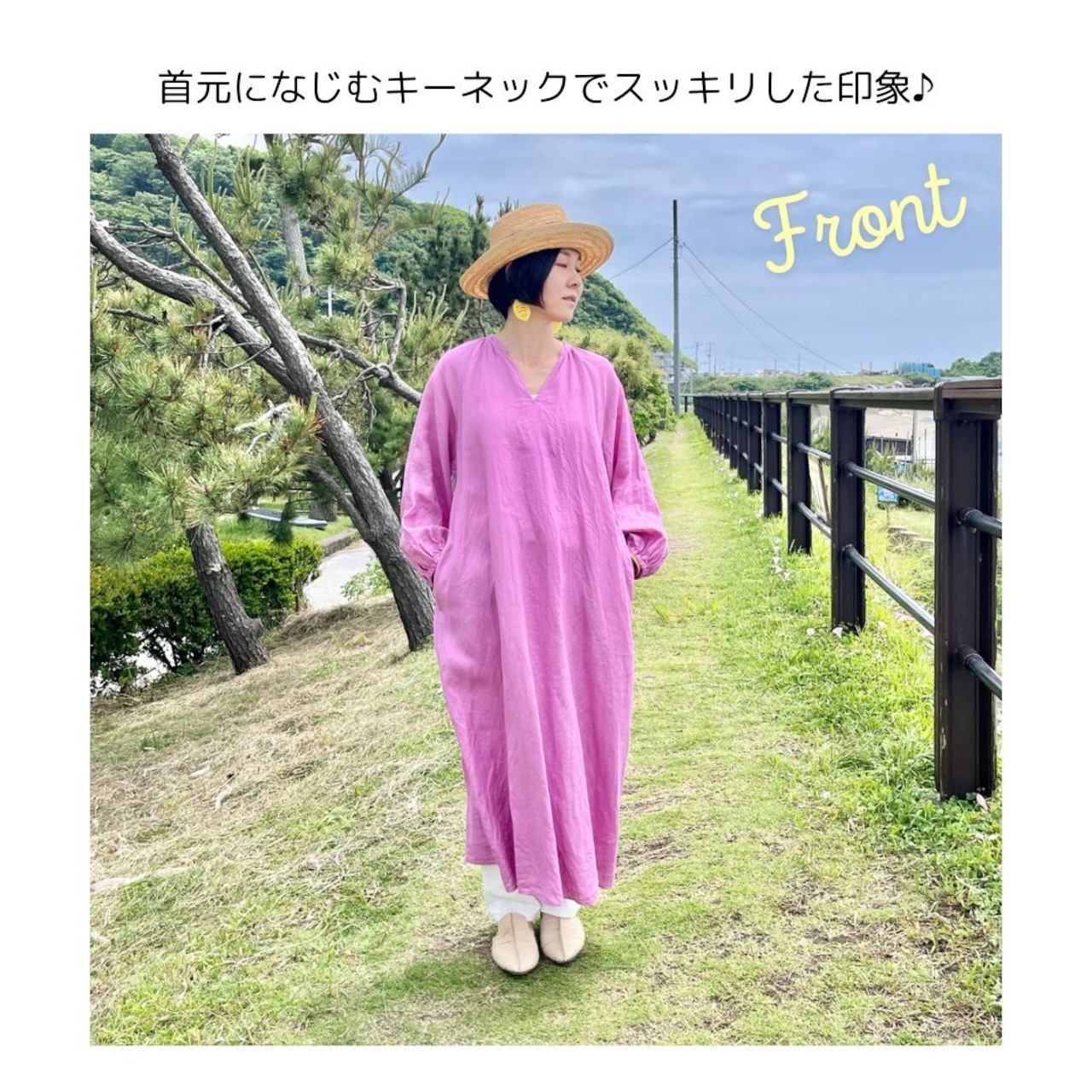 フレンチリネン100%のワンピースシリーズは、コロリーダスの黄金の草アクセサリーやブラジルレース小物を合わせやすく、コロリーダスのスタッフが こだわって企画したオリジナル商品です。コーディネートしやすいシンプルさの中に、シルエットや細部にこだわったデザイン、カラフルな色合いが目を引く、着心地のよいワンピースシリーズです。