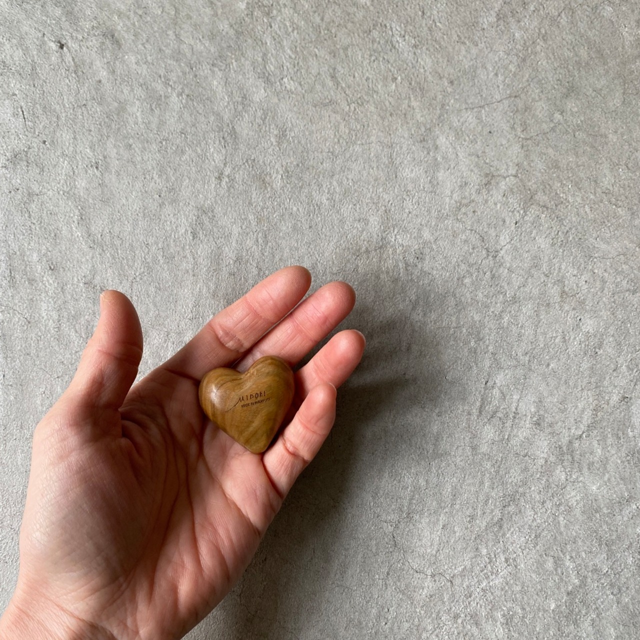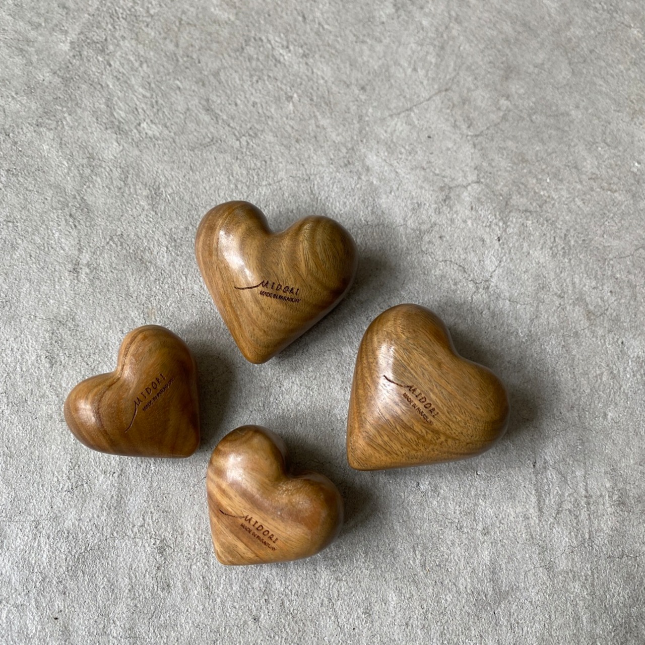 パラグアイのグリーンパロサントのハートのにぎたま。Mサイズと少し大きめのLサイズをご用意しております。