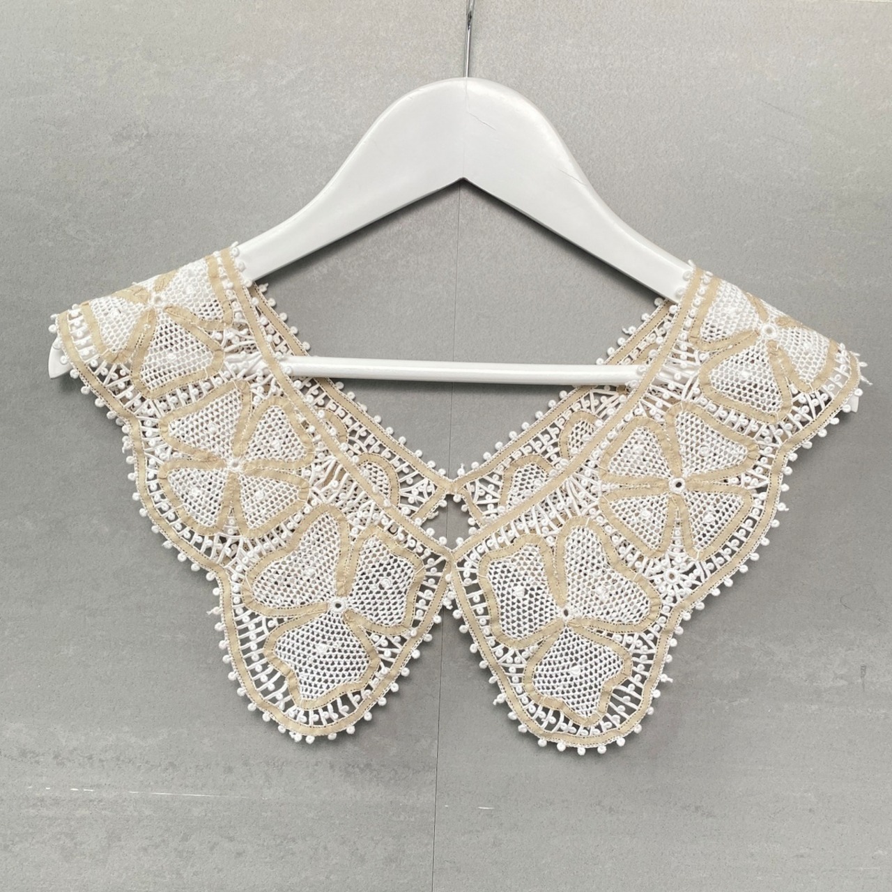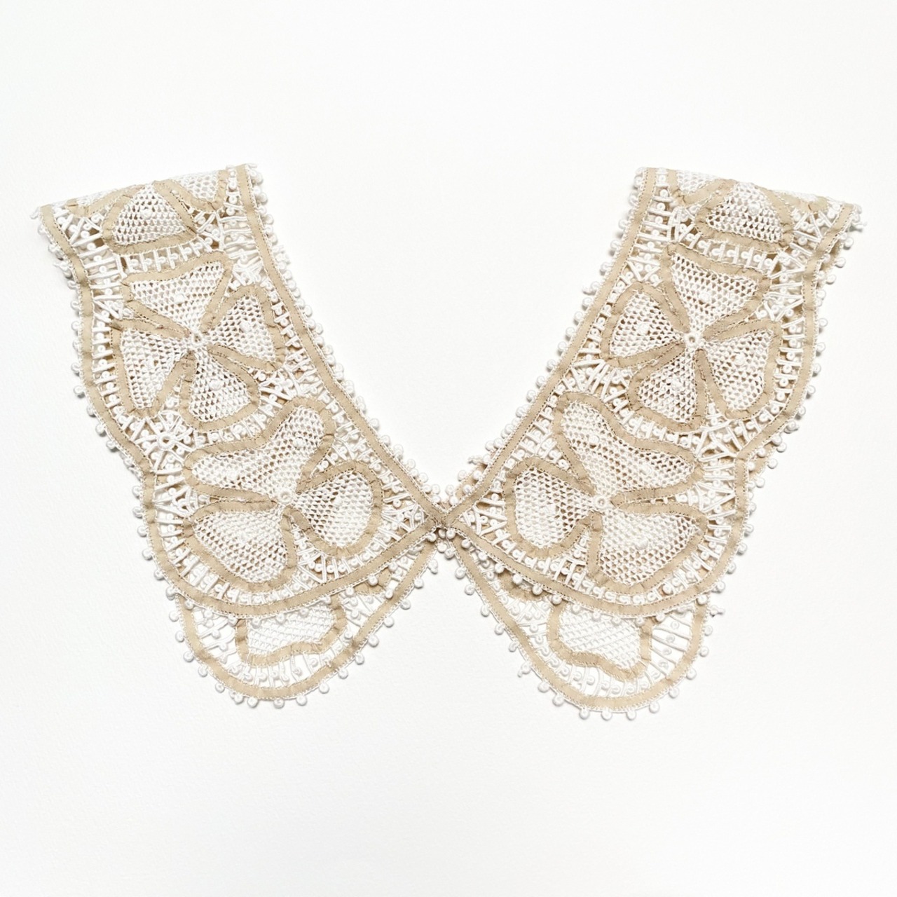 特別に製作したベージュと白の配色フラワーモチーフの衿レース。