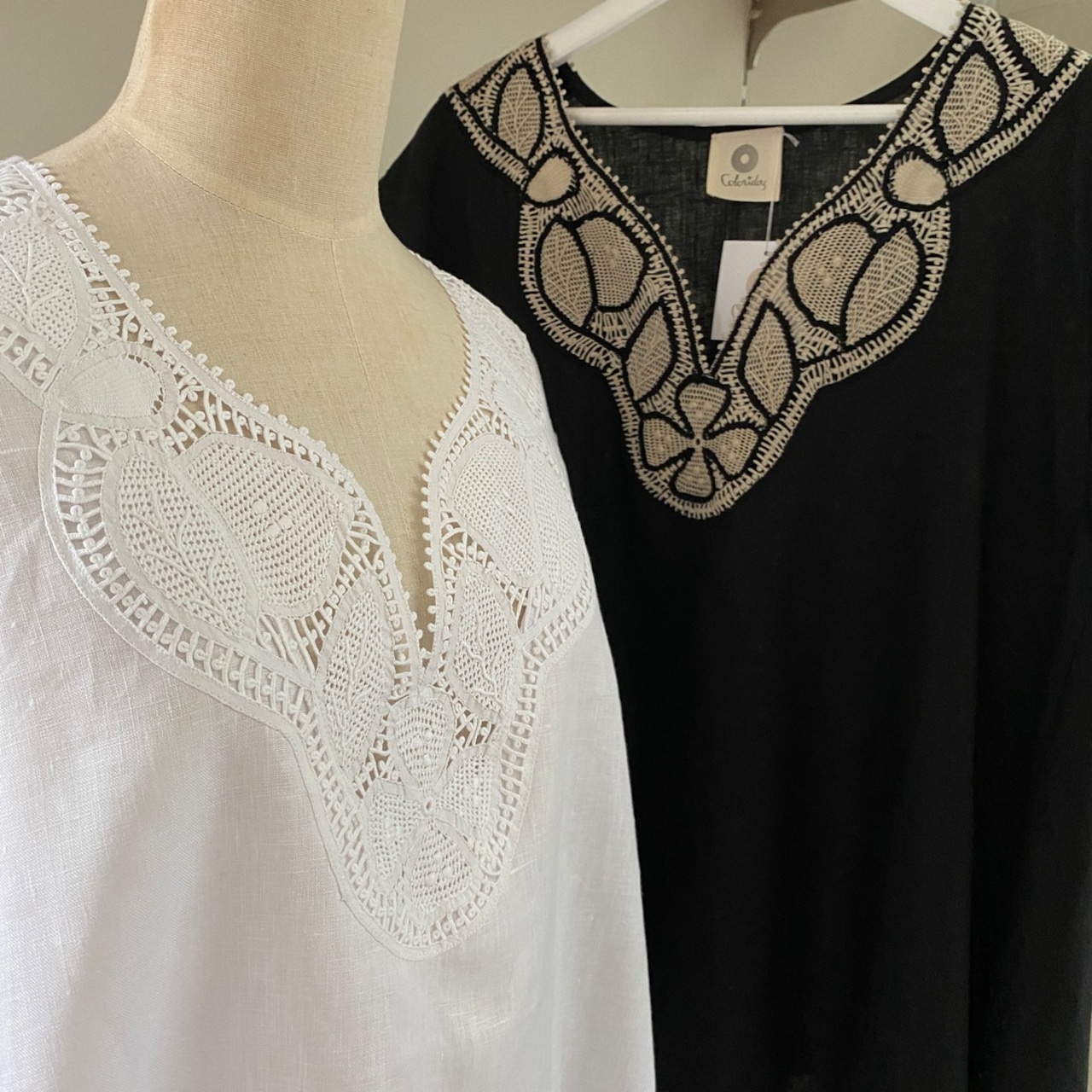 ブラジルの伝統工芸のルネッサンスレース(ニードルレース)編みを胸元にあしらった