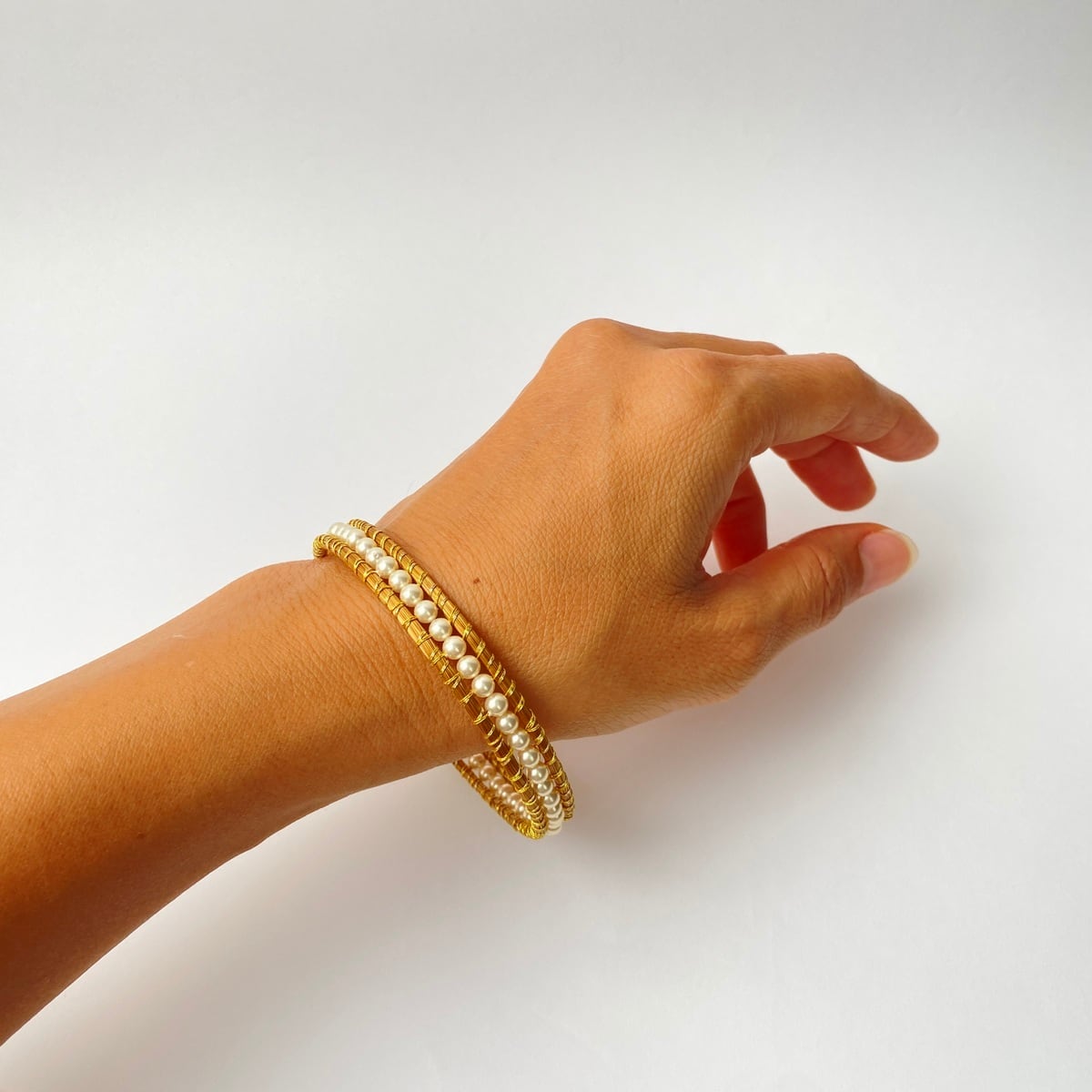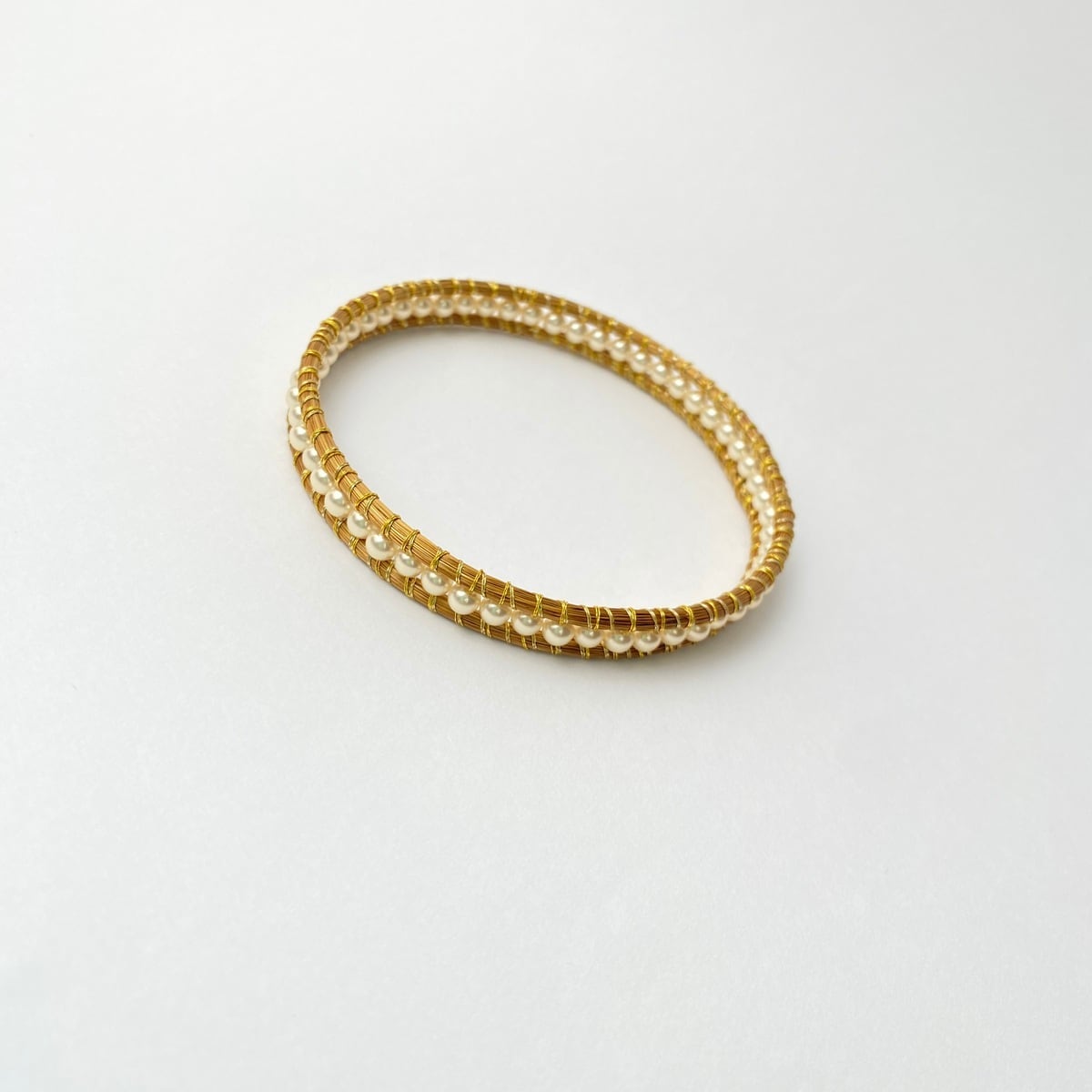 黄金の草バングルの間に天然石やパールを編みつないだデザインシリーズです。