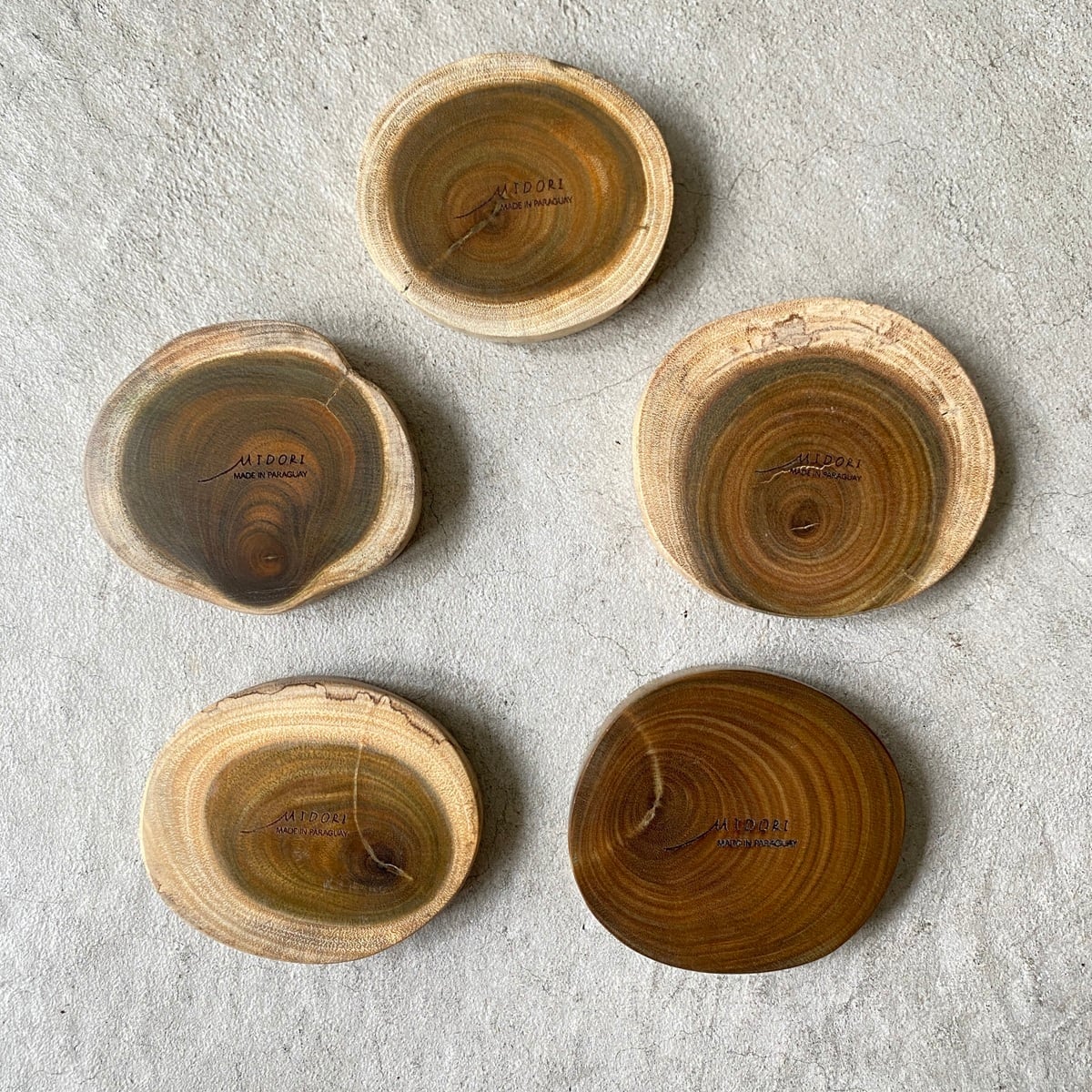 いろいろな部分を心おもむくままに、ミドリの職人が切り取って加工しておりますので様々な形、大きさで同じものはいっさいありません。
